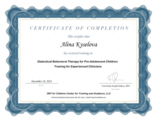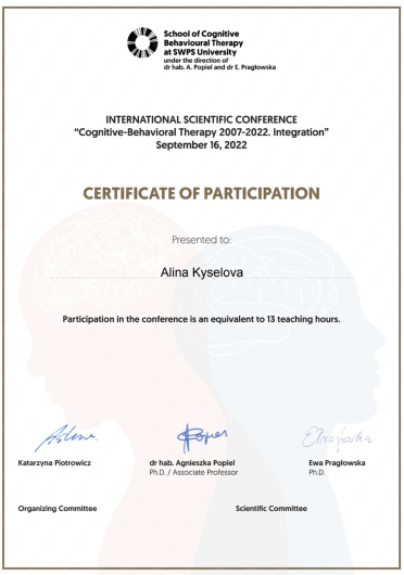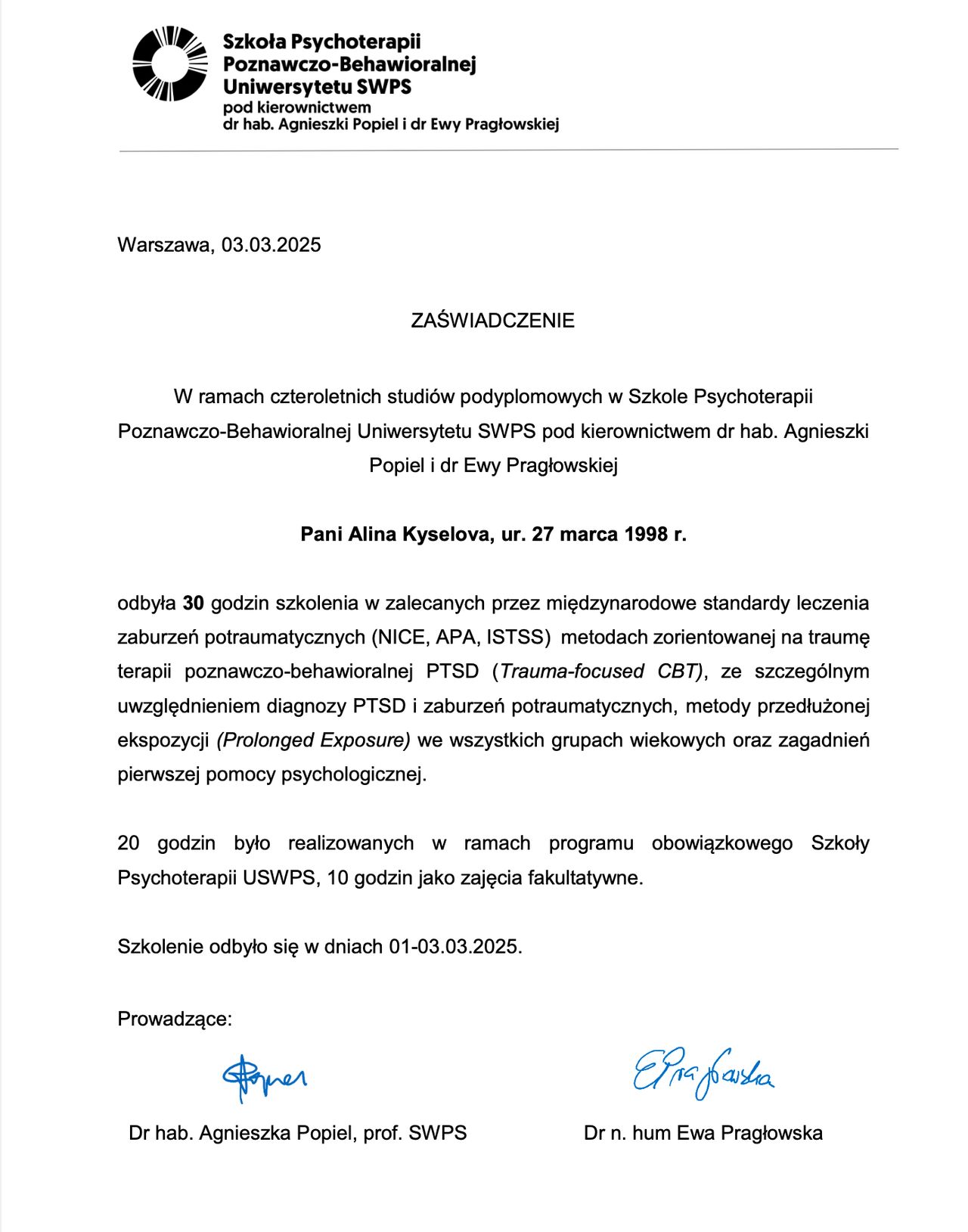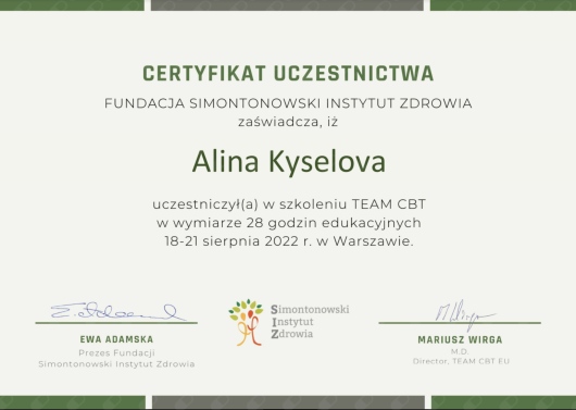 Miałam kilka mięsięczną terapię z Panią Aliną Kyselovą. Na karzdym spotkaniu byłam wysłuchana. Słowa i pytania Pani Aliny byli bardzo do mnie trafione. Dziękuję i polecam!
