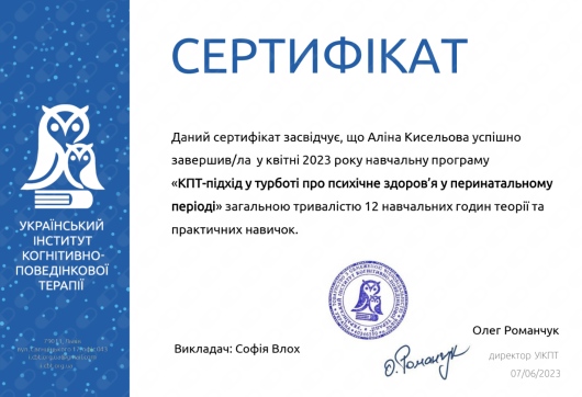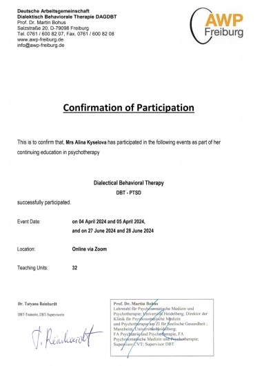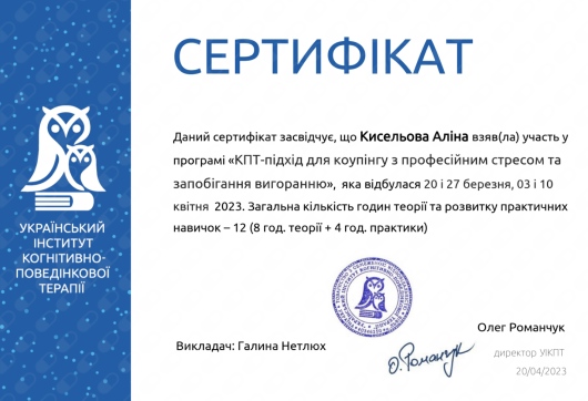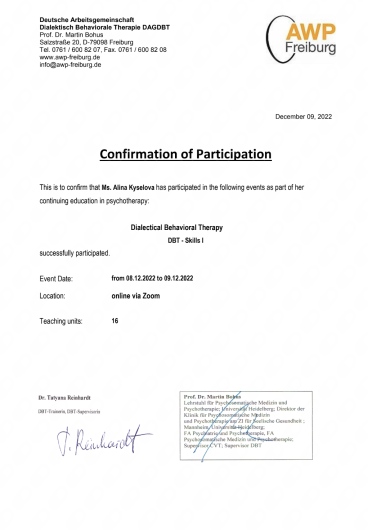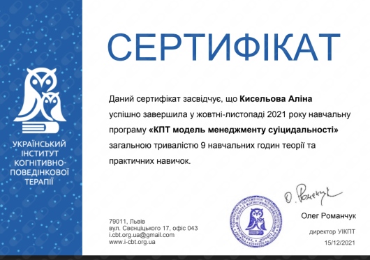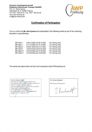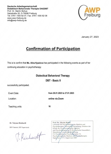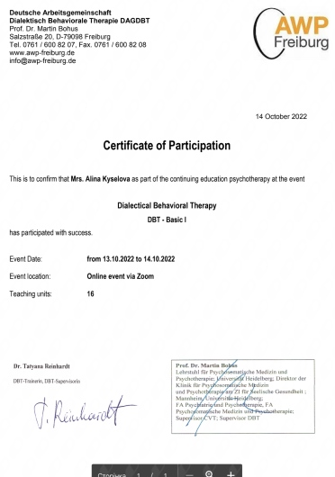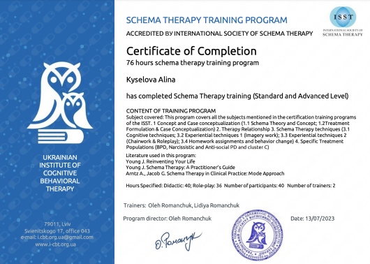 Я психолог і психотерапевт, спеціалізуюся на підході когнітивно-поведінкового підходу. Моя терапевтична робота базується на поєднанні традиційних методів цього підходу з передовими техніками третьої хвилі терапії. Моя освіта включає навчання в Діалектично-поведінковій терапії (ДПТ), а також в Терапії Схем (ТС).