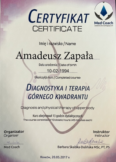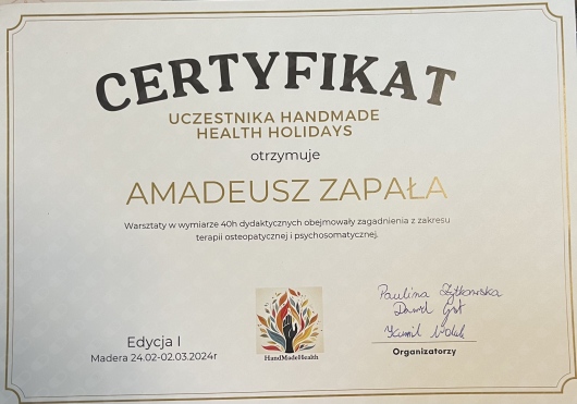 Jaki jest zakres porad oferowanych przez Amadeusz Zapała?Amadeusz Zapała to fizjoterapeuta. Na podstawie swojego doświadczenia i wykształcenia Amadeusz Zapała oferuje usługi takie jak: fizjoterapia, osteopatia, rehabilitacja, rehabilitacja dzieci, fizjoterapia uroginekologiczna, fizjoterapia stomatologiczna, Terapia blizny, Terapia manualna, terapia mięśniowo-powięziowa, akupunktura.