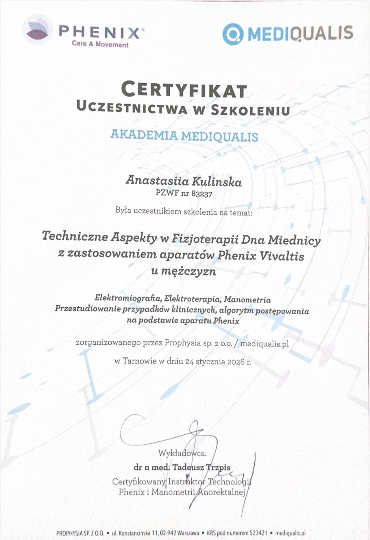 W terapii łączę nowoczesne technologie, terapię manualną oraz pracę z ciałem i umysłem, co pozwala osiągnąć skuteczną i długotrwałą poprawę zdrowia. Wierzę, że ciało i umysł są ze sobą ściśle powiązane, dlatego moim celem jest nie tylko leczenie dolegliwości, ale również edukacja i wspieranie kobiet w budowaniu świadomości własnego ciała.