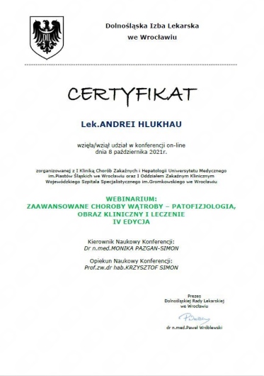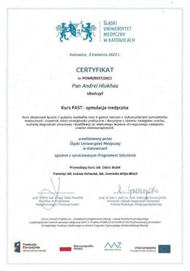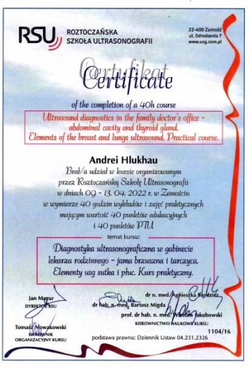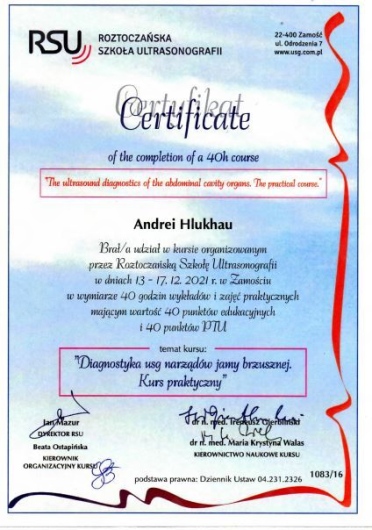 Dyplom lekarza uzyskałem w 1997 roku po ukończeniu studiów na Wydziale Lekarskim Uniwersytetu Medycznego w Mińsku. W 1998 roku uzyskałem tytuł specjalisty z chorób wewnętrznych, a w 2005 roku tytuł specjalisty z diagnostyki ultrasonograficznej. Posiadam liczne certyfikaty potwierdzające kwalifikacje m.in. z Roztoczańskiej Szkoły Ultrasonografii. Jestem członkiem Polskiego Towarzystwa Ultrasonograficznego. Swoje zainteresowania rozwijam uczestnicząc w kursach i konferencjach, zarówno krajowych, jak i zagranicznych. W codziennej praktyce zajmuję się przede wszystkim wykonywaniem: - USG piersi, - USG węzłów chłonnych, - USG dróg moczowych, - USG jamy brzusznej, - USG tarczycy, - USG tkanek miękkich, - USG ślinianek, - USG inne. W życiu prywatnym cenię sobie najbardziej rodzinę. Interesuję się historią, więc chętnie czytam książki na ten temat oraz odwiedzam różne miejsca zabytkowe. Od dzieciństwa pasjonuję się pływaniem. Nie wyobrażam swojego życia bez sportu. Warto również dodać, że muzyka to integralna część mojego życia; uwielbiam grać na gitarze oraz chodzić na koncerty rockowe. Ale niewątpliwie moja największą pasją jest bycie lekarzem!