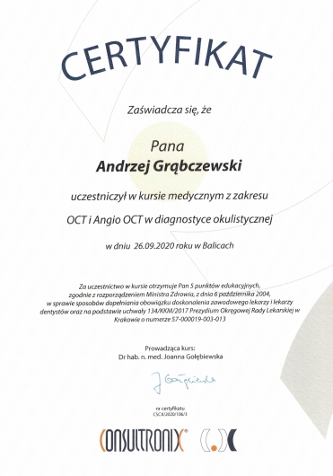 Jaki jest zakres porad oferowanych przez Andrzej Grąbczewski?Andrzej Grąbczewski to okulista. Na podstawie swojego doświadczenia i wykształcenia Andrzej Grąbczewski oferuje usługi takie jak: gonioskopia - badanie kąta przesączania, USG gałki ocznej, badanie OCT, konsultacja okulistyczna (pierwsza wizyta), pomiar ciśnienia śródgałkowego, pakiet badań diagnostycznych, kapsulotomia, irydotomia, meibografia, pakiet jaskra.
