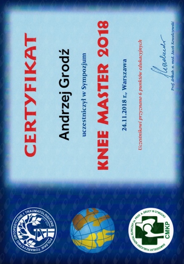 Członek Europejskiego Towarzystwa Medycyny Sportowej, Chirurgii Kolana i Artroskopii (ESSKA)