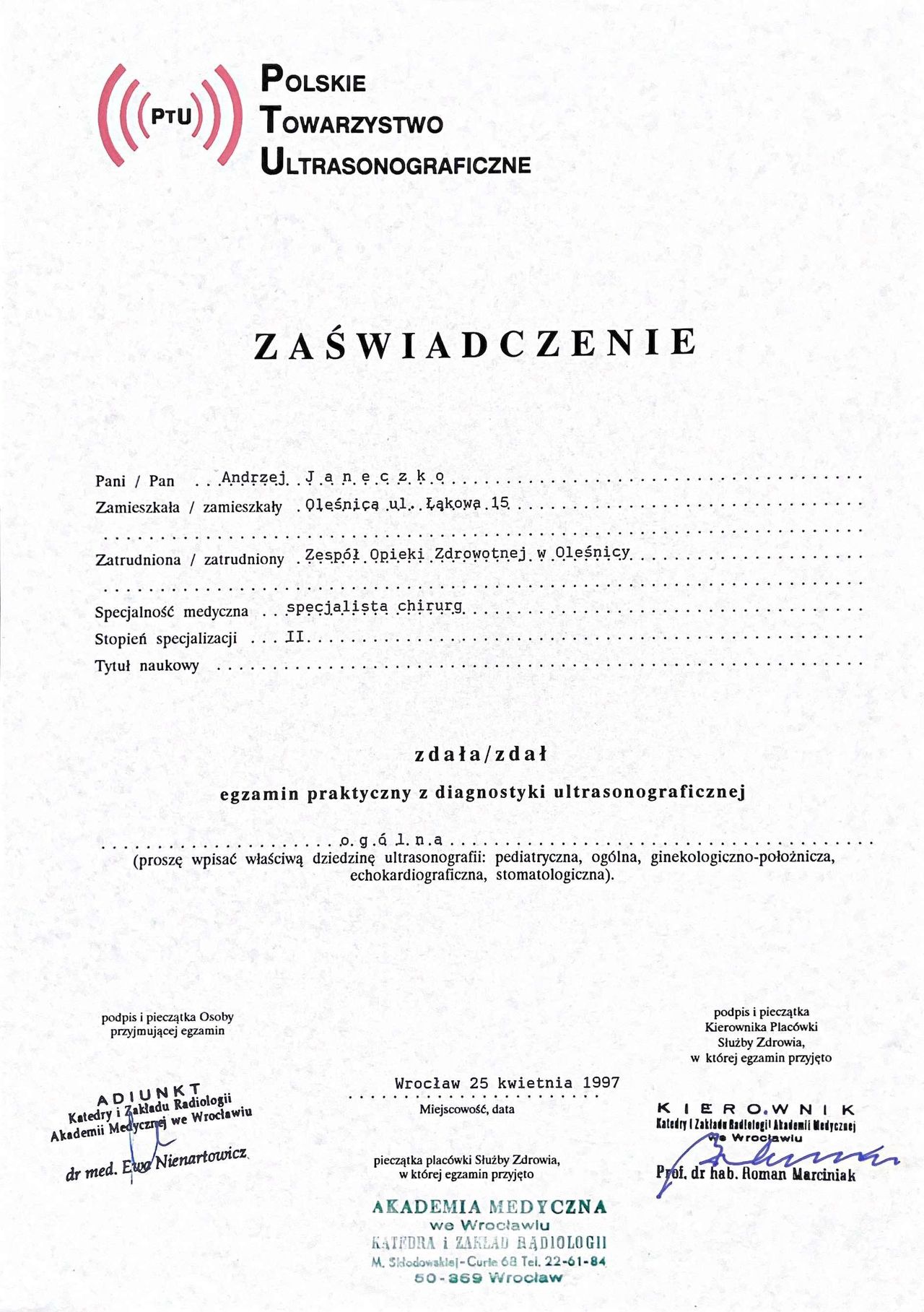 W 1999 roku uzyskałem stopień naukowy doktora nauk medycznych w zakresie medycyny - radiodiagnostyki.