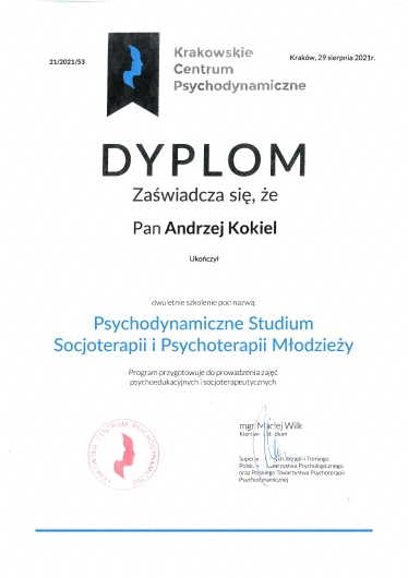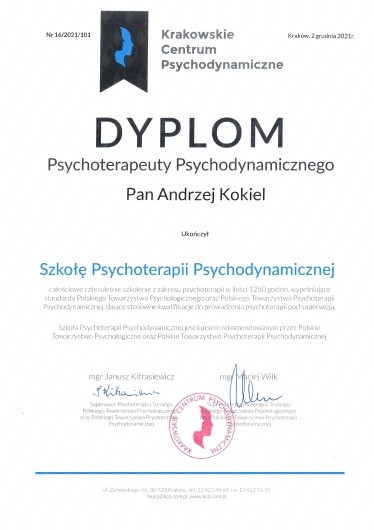 Jestem doktorem nauk społecznych i certyfikowanym psychoterapeutą psychodynamicznym z wieloletnim doświadczeniem. Specjalizuję się w psychoterapii psychodynamicznej, oferując pomoc młodzieży, dorosłym i parom. Moim celem jest wspieranie pacjentów w odkrywaniu ich mocnych stron, zrozumieniu głębokich przyczyn trudności oraz osiąganiu pełni potencjału. Moje specjalizacje: Psychoterapia indywidualna młodzieży i dorosłych Psychoterapia par Diagnoza psychologiczna Zaburzenia depresyjne Zaburzenia lękowe Zaburzenia osobowości Edukacja i doświadczenie: Posiadam tytuł doktora nauk społecznych. Ukończyłem czteroletnią Szkołę Psychoterapii Psychodynamicznej oraz Psychodynamiczne Studium Socjoterapii i Psychoterapii Młodzieży Krakowskiego Centrum Psychodynamicznego, posiadające akredytację Polskiego Towarzystwa Psychologicznego. Odbyłem staż w Klinice na V Oddziale Ogólnopsychiatrycznym z Pododdziałem Zaburzeń Afektywnych w Szczecinie. Dodatkowe informacje: Regularnie uczestniczę w szkoleniach i konferencjach poświęconych psychologii i psychoterapii, aby poszerzać swoją wiedzę i doskonalić umiejętności terapeutyczne. Fascynuje mnie rozwój osobisty i pomaganie innym w odkrywaniu ich potencjału. Zapraszam, jeśli: Doświadczasz trudności emocjonalnych, takich jak depresja, lęk, stres. Masz problemy w relacjach z innymi ludźmi. Chcesz lepiej zrozumieć siebie i swoje zachowania. Potrzebujesz wsparcia w radzeniu sobie z kryzysami życiowymi. Szukasz profesjonalnej pomocy w rozwiązaniu problemów osobistych. Podejście terapeutyczne: W swojej pracy opieram się na podejściu psychodynamicznym, które pozwala na głębokie zrozumienie problemów pacjenta i znalezienie trwałych rozwiązań. Tworzę bezpieczną i pełną akceptacji atmosferę, w której możesz otwarcie mówić o swoich uczuciach i doświadczeniach.