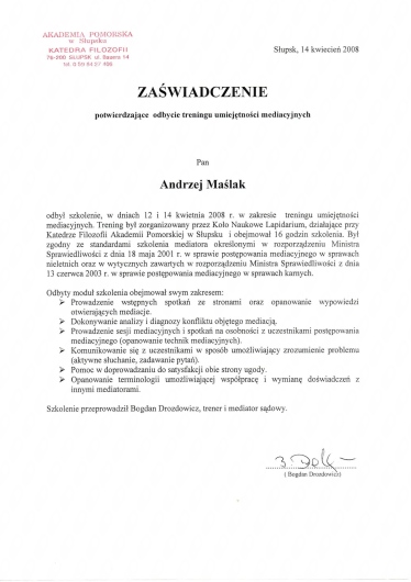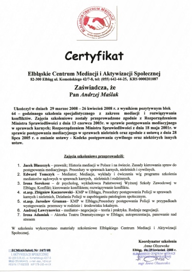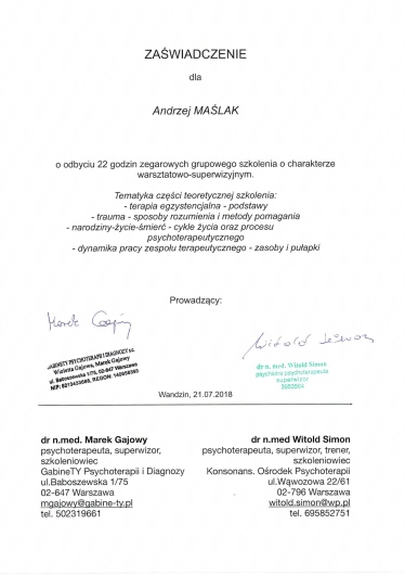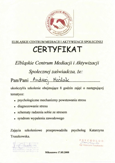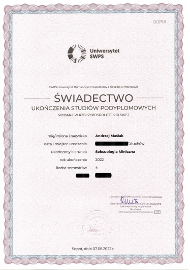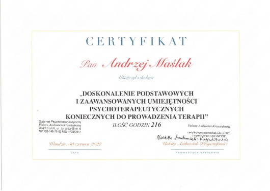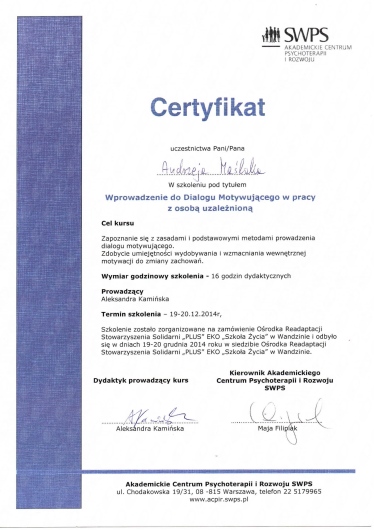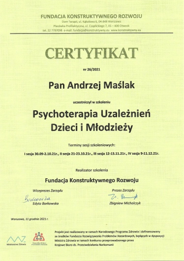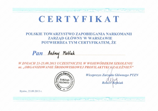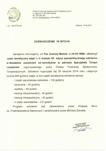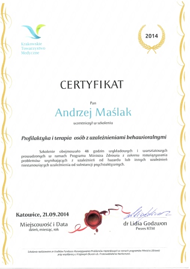Jestem Specjalistą Psychoterapii Uzależnień, a sam Certyfikat uzyskałem pod akredytacją Krajowego Biura Do Spraw Przeciwdziałania Narkomanii (dzisiejsze: Krajowe Centrum Przeciwdziałania Uzależnieniom), kończąc 4 letnie szkolenie w Gdańsku.