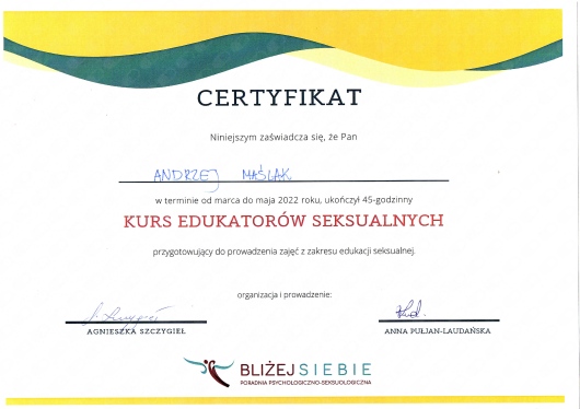 - Kurs Edukatorów seksualnych, Poradnia Psychologiczno-Seksuologiczna "Bliżej Siebie", Gdynia