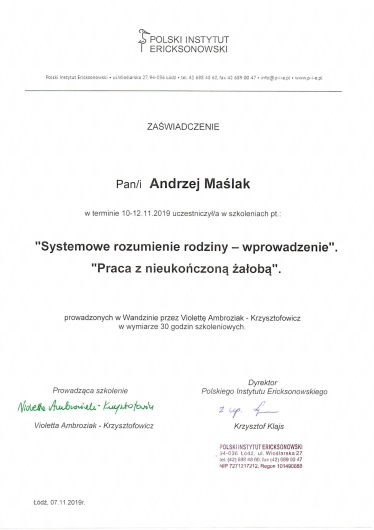 - Szkolenie „Systemowe rozumienie rodziny – wprowadzenie” oraz „Praca z nieukończoną żałobą”, Łódź,