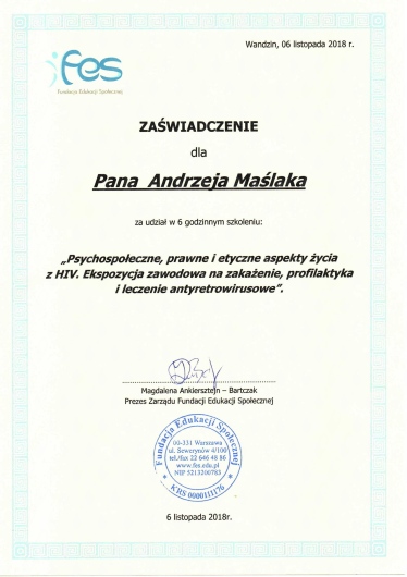 - Szkolenie „Psychologiczne, prawne i etyczne aspekty życia z HIV. Ekspozycja zawodowa na zakażenie, profilaktyka i leczenie antyretrowirusowe”, Wandzin,