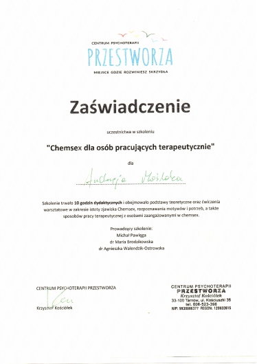 - Szkolenie „Chemsex dla osób pracujących terapeutycznie”, Centrum Psychoterapii Przestworza, Kraków