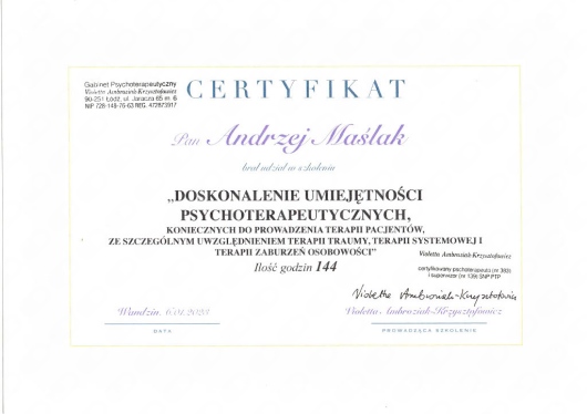 - Szkolenie „Doskonalenie umiejętności psychoterapeutycznych ze szczególnym uwzględnieniem terapii traumy, terapii systemowej i terapii zaburzeń osobowości”, Wandzin