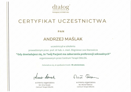 - Szkolenie „Gdy dowiadujesz się, że Twój Pacjent ma zaburzenia preferencji seksualnych”, Centrum Terapii DIALOG, Warszawa,