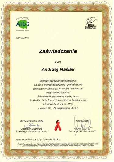 - Specjalistyczne szkolenie dla osób prowadzących zajęcia profilaktyczne dotyczące problematyki HIV/AIDS i narkomanii, Konstancin – Jeziorna,