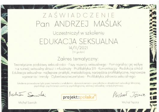 - Szkolenie „Edukator seksualny”, Projekt Polska, Warszawa,