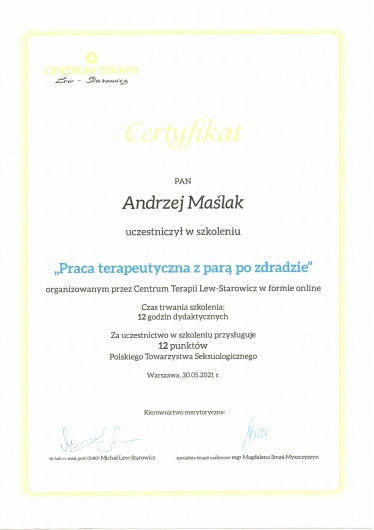 - Szkolenie „Praca terapeutyczna z parą po zdradzie”, Centrum Terapii Lew-Starowicz, Warszawa,