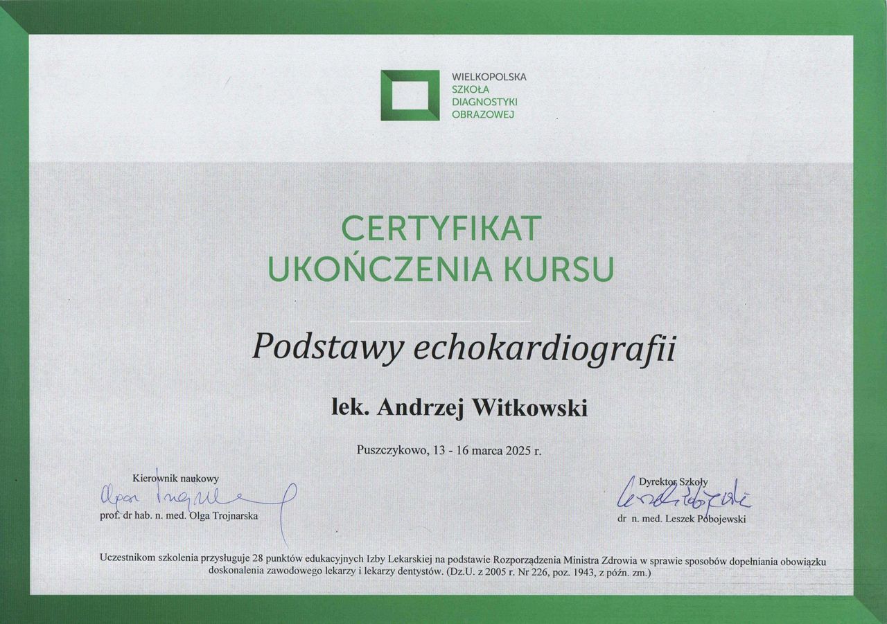 Jaki jest zakres porad oferowanych przez Andrzej Witkowski?Andrzej Witkowski to w trakcie specjalizacji (kardiolog). Na podstawie swojego doświadczenia i wykształcenia Andrzej Witkowski oferuje usługi takie jak: konsultacja kardiologiczna, ECHO serca, EKG + opis - dorośli, Holter ciśnieniowy, Holter EKG, konsultacja kardiologiczna + ECHO serca, konsultacja kardiologiczna + ECHO serca + EKG (pierwsza wizyta), konsultacja kardiologiczna + EKG, konsultacja kardiologiczna + EKG + ECHO serca.