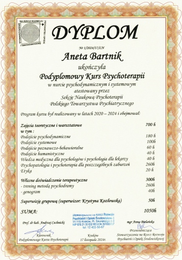 Jaki jest zakres porad oferowanych przez Aneta Bartnik?Aneta Bartnik to psycholog, psychoterapeuta. Na podstawie swojego doświadczenia i wykształcenia Aneta Bartnik oferuje usługi takie jak: psychoterapia partnerska, psychoterapia rodzinna, Psychoterapia, psychoterapia indywidualna, Konsultacja psychologiczna, psychoterapia par i małżeństw, psychoedukacja, konsultacja psychoterapeutyczna.