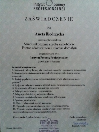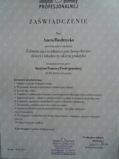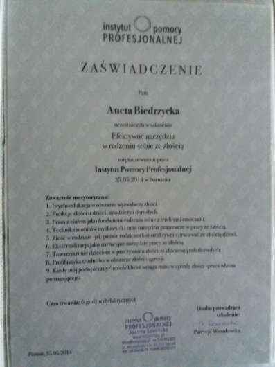 Polecam. Pani Aneta jest bardzo otwartą osobą, potrafi słuchać i jest zaangażowana.