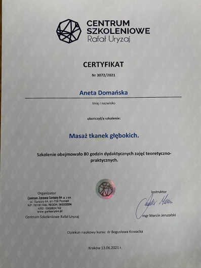Polecam Panią Anetę, to bardzo profesjonalna i miła osoba. Podchodzi do pacjenta z pełnym zaangażowaniem i sercem, a co najważniejsze, dzięki jej pomocy, moja kontuzja ustała. Kompleksowe podejście do problemu, dało pozytywne efekty. Rekomenduję z całego serca. :)