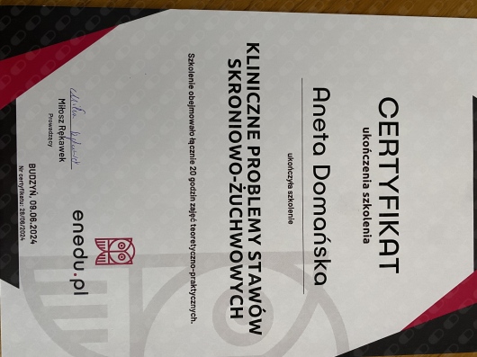 Polecam panią Anetę Domańską! Jest doskonałą fizjoterapeutką, która świetnie zna się na swoim fachu. Od samego początku czułem, że naprawdę angażuje się w rozwiązanie mojego problemu z kolanem. Dzięki jej wiedzy i indywidualnemu podejściu moja rehabilitacja przebiegała sprawnie i efektywnie. To specjalistka, której można zaufać!
