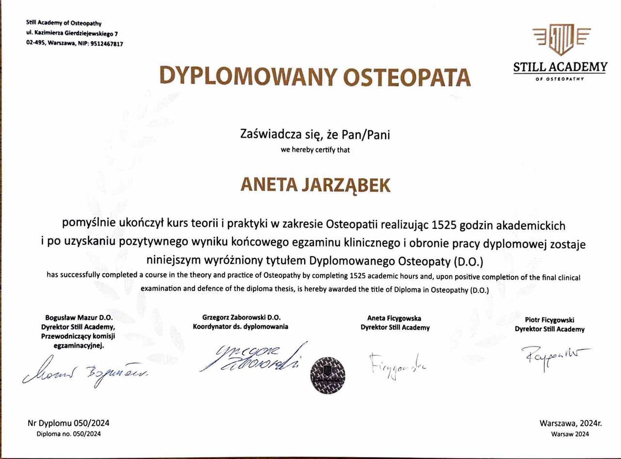 Jaki jest zakres porad oferowanych przez Aneta Jarzabek?Aneta Jarzabek to osteopata, fizjoterapeuta. Na podstawie swojego doświadczenia i wykształcenia Aneta Jarzabek oferuje usługi takie jak: konsultacja fizjoterapeutyczna (kolejna wizyta), terapia wisceralna, Terapia czaszkowo-krzyżowa, Fizjoterapia (pierwsza wizyta), osteopatia, terapia CranioSacralna, fizjoterapia uroginekologiczna, fizjoterapia, Fizjoterapia dyskopatii w ostrym stanie.
