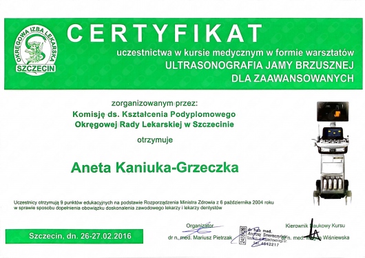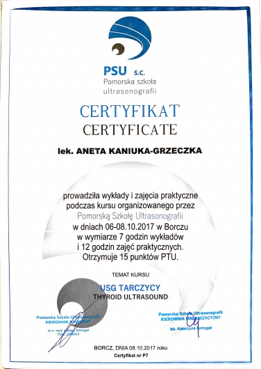 Jaki jest zakres porad oferowanych przez Aneta Kaniuka-Grzeczka?Aneta Kaniuka-Grzeczka to radiolog. Na podstawie swojego doświadczenia i wykształcenia Aneta Kaniuka-Grzeczka oferuje usługi takie jak: USG brzucha, USG piersi, USG szyi (ocena ślinianek, tarczycy, węzłów chłonnych), USG tarczycy, USG tkanek miękkich, USG węzłów chłonnych, USG ślinianek, USG układu moczowego, USG moszny i jąder, USG prostaty.