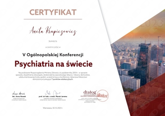 Jej zaangażowanie, cierpliwość i trafność w doborze leczenia sprawiły, że dziś jestem zupełnie inną osobą. Dzięki niej odzyskałam siebie i mogę z pełną odpowiedzialnością powiedzieć, że podarowała mi drugie, zdrowe i normalne życie. Dziękuję to za mało.• Klinika Zdrowego Umysłu • kolejna wizyta psychiatryczna - kontynuacja diagnozy •