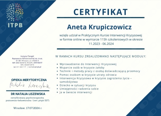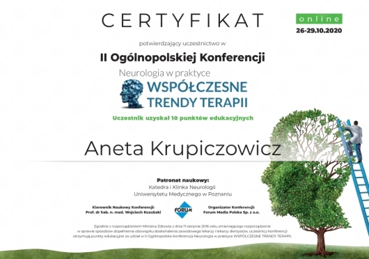 Czy Aneta Krupiczowicz przyjmuje online, bez konieczności pojawiania się w placówce?Tak, Aneta Krupiczowicz oferuje konsultacje online. Wybierz opcję „konsultacja online” przy umawianiu wizyty, a zobaczysz dostępne terminy.