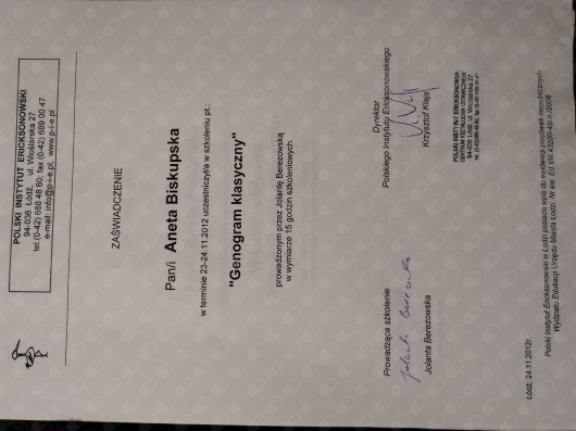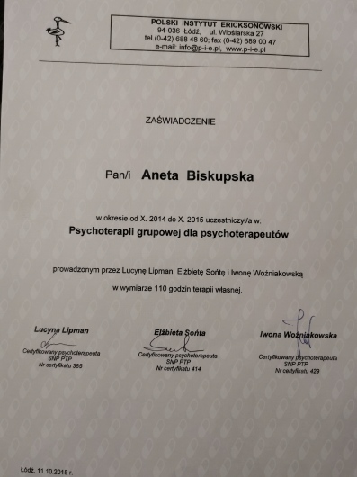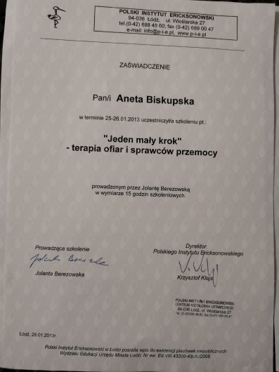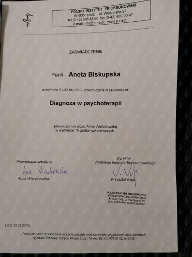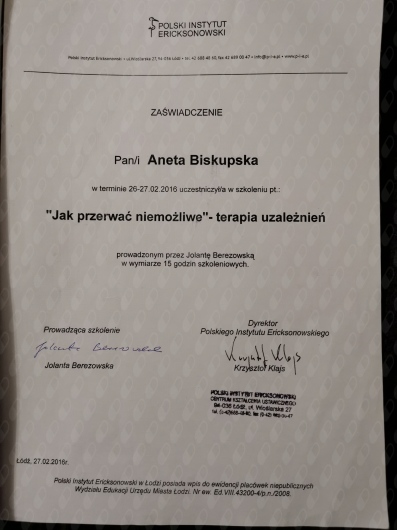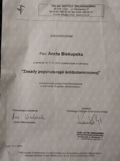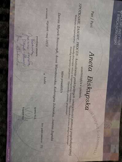Ukończyłam czteroletni kurs psychoterapii ericksonowskiej, który wyposażył mnie w narzędzia oparte na uważności, wyobraźni, elastyczności oraz głębokim szacunku do autonomii klienta. Obecnie kontynuuję rozwój zawodowy w ramach studiów podyplomowych z psychologii klinicznej dzieci i młodzieży.