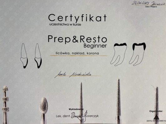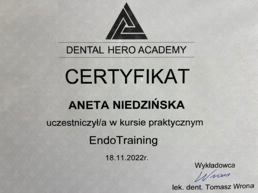 Zawsze pracuję w powiększeniu - używam lup stomatologicznych lub mikroskopu, aby każdy zabieg był maksymalnie precyzyjny. Stale poszerzam swoją wiedzę na kursach i szkoleniach.
