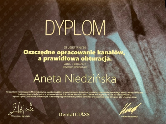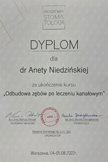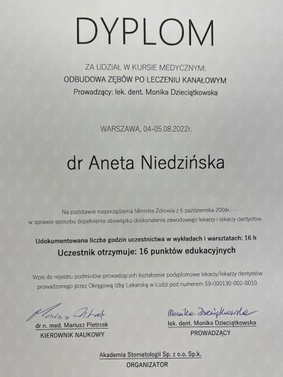 Jestem bardzo zadowolona z wizyt u dr. Anety Niedzińskiej.Już od pierwszej wizyty poczułam się komfortowo i dobrze zaopiekowana. Doktor dokładnie wyjaśniała każdy krok leczenia, co sprawiło, że czułam się pewnie i spokojnie. Pani Doktor podejście do pacjenta jest niezwykle profesjonalne i empatyczne. Dodatkowo, gabinet jest nowoczesny i czysty, co również buduje zaufanie. Zdecydowanie polecam dr. Niedzińską każdemu, kto szuka kompetentnego i życzliwego stomatologa!
