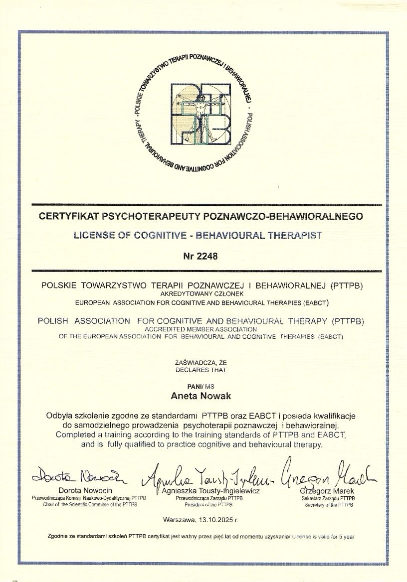 Nazywam się Aneta Nowak i jestem psychologiem ze specjalnością kliniczną oraz certyfikowanym psychoterapeutą poznawczo-behawioralnym CBT (nr 2248). Od ponad 13 lat pracuję z osobami dorosłymi, wspierając je w radzeniu sobie z trudnościami emocjonalnymi, w szczególności zaburzeniami lękowymi oraz depresją. Pomagam osobom doświadczającym przewlekłego stresu, napięcia, obniżonego nastroju czy poczucia zagubienia, wspólnie poszukując skutecznych sposobów na odzyskanie równowagi i poprawę jakości życia. Ukończyłam studia na Uniwersytecie SWPS w Warszawie, a swoje doświadczenie zdobywałam w placówkach medycznych i edukacyjnych, stale rozwijając kompetencje poprzez udział w specjalistycznych szkoleniach i warsztatach.