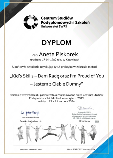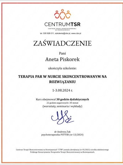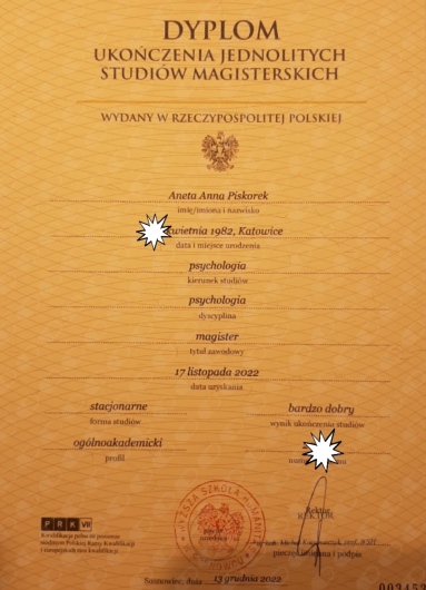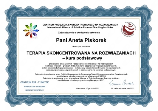 Terapii Skoncentrowanej na Rozwiązaniach oraz Polskiego Towarzystwa Psychologicznego. Tytuł mgr psychologii uzyskałam w Wyższej Szkole Humanitas w Sosnowcu z oceną bardzo dobrą. Nieszablonowe podejście do wykorzystania zdobytej wiedzy nabyłam podczas szkolenia I i II stopnia w nurcie Terapii Skoncentrowanej na Rozwiązaniu (TSR).