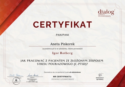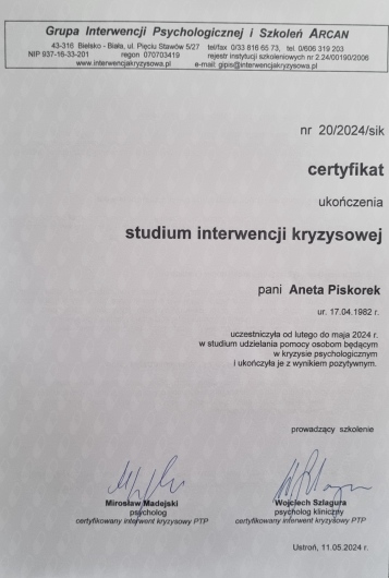 W tym też nurcie nadal uzupełniam wiedzę uczęszczając regularnie na szkolenia specjalistyczne, w tym m.in. szkolenia z zakresu terapii par. Drugą nogą mojej edukacji jest wiedza z zakresu interwencji kryzysowej – dzięki niej jestem w stanie być pomocna zarówno wówczas, gdy problemy generuje nasza głowa i emocje, jak i wtedy – gdy dostarcza nam ich samo życie.