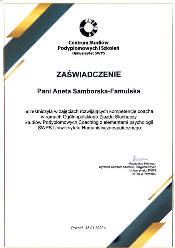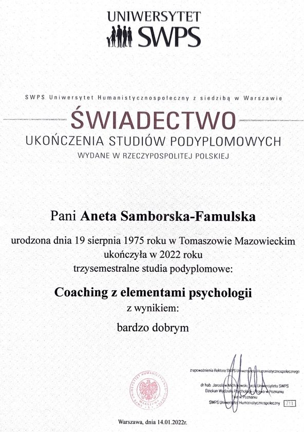 Prowadzę także warsztaty rozwoju osobistego z zakresu life i business coachingu w następujących obszarach: odkrywania i rozwijania talentów i mocnych stron, rozwijania pewności siebie i budowania poczucia własnej wartości, asertywności i dbania o własne granice, wyznaczania kierunku kariery, radzenia sobie z syndromem wypalenia zawodowego, budowania odporności na stres i radzenia sobie ze stresem, rozwiązywania trudnych sytuacji czy konfliktów w pracy, rodzinie, związku pokonywania trudności w komunikacji i sięganiem po efektywne i nieprzemocowe style komunikacji, odkrywania pasji i zainteresowań. Ukończyłam kurs MBSR (Mindfulness-Based Stress Reduction / Redukcja Stresu Oparta na Uważności), dzięki temu w swojej pracy terapeutycznej i coachingowej, stosuję techniki mindfullness, które przynoszą bardzo dobre efekty terapeutyczne, min. takie jak większa energia i entuzjazm w życiu, większa zdolność umiejętności relaksowania się, poprawa samooceny, zmniejszenie poziomu/nasilenia bólu i zwiększenie zdolności do radzenia sobie z chronicznym bólem, umiejętności radzenia sobie bardziej efektywnie w sytuacjach stresowych zarówno krótko- jak i długotrwałych.