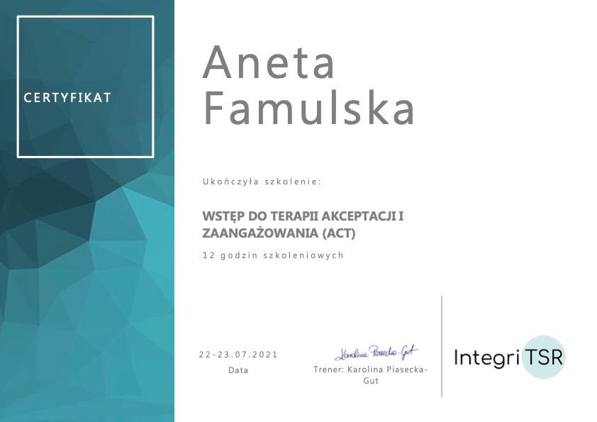Właśnie skończyłam terapię z Panią Anetą. Poczułam, że mogę iść przez życie sama, a były momenty, że wyczekiwałam kolejnego spotkania. Jestem silniejsza, spokojniejsza, szczęśliwsza. Trudności życiowe są obecne, ale jestem w stanie im sprostać. Doceniłam swoje Szczęśliwe Dziecko i wyhodowałam Zdrowego Dorosłego. Pani Aneta, jej droga, doświadczenie, pasja i empatia są ogromne. Jest dla mnie inspiracją. Bardzo mi pomogła i to w wielu obszarach. Bardzo lubię ją jako człowieka! Dziękuję Pani Aneto i do zobaczenia.