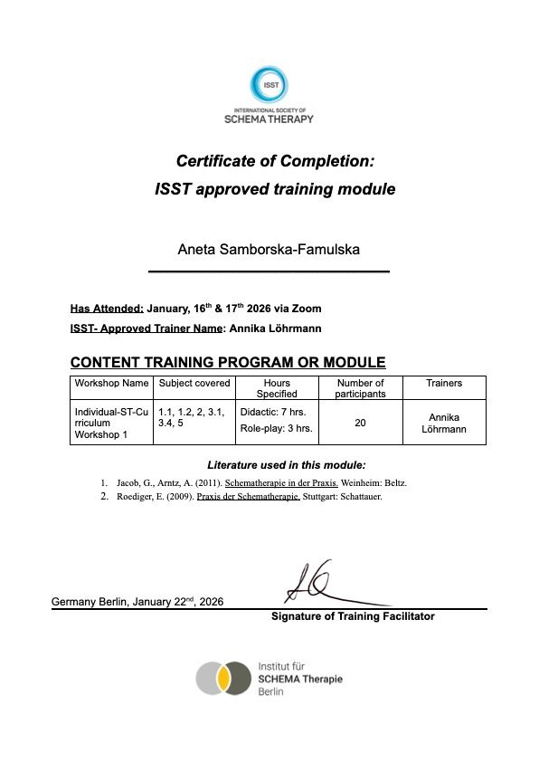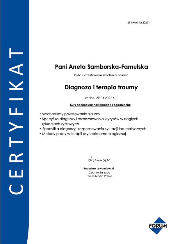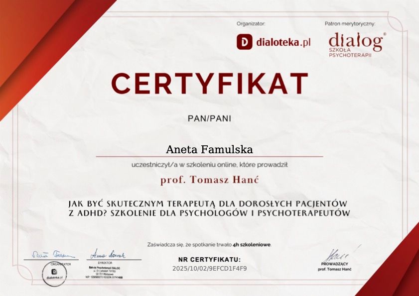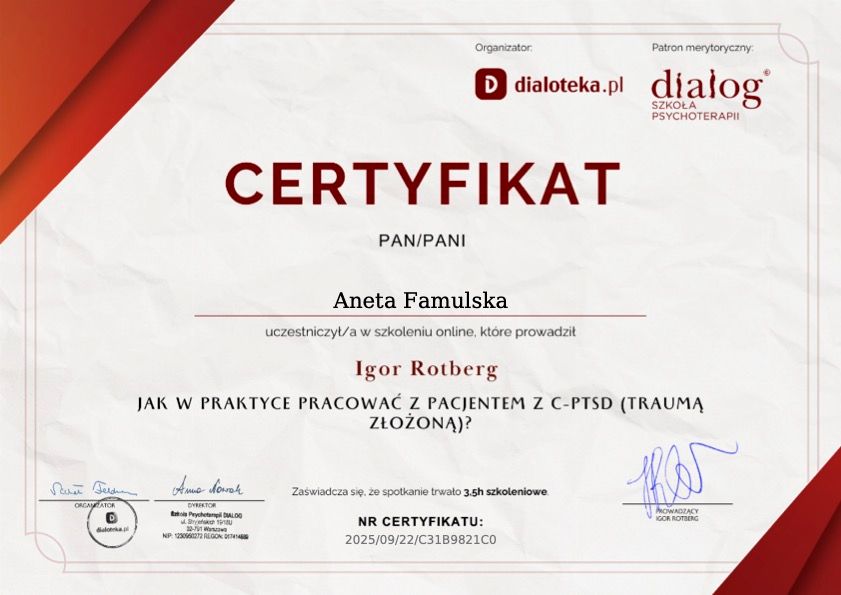 Po niezbyt udanym doświadczeniu z moim pierwszym terapeutą długo wahałam się, czy ponownie szukać pomocy. Na szczęście trafiłam do Pani Anety – i od pierwszej chwili wiedziałam, że tym razem będzie inaczej. Już podczas pierwszego spotkania poczułam się bezpiecznie i z poczuciem, że trafiłam do odpowiedniej osoby. Pani Aneta ma w sobie niezwykłe ciepło, empatię i spokój, które dają przestrzeń do bycia sobą, bez lęku przed oceną. Słucha z uważnością, zadaje trafne pytania i potrafi stworzyć atmosferę prawdziwego zrozumienia.