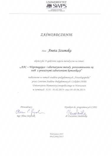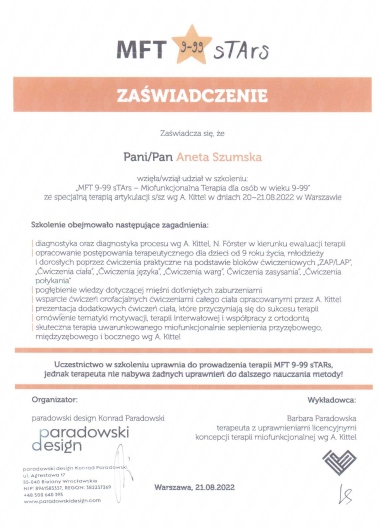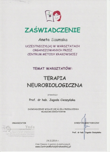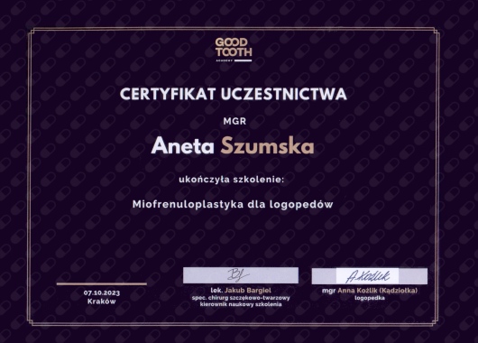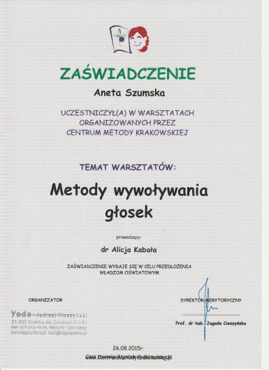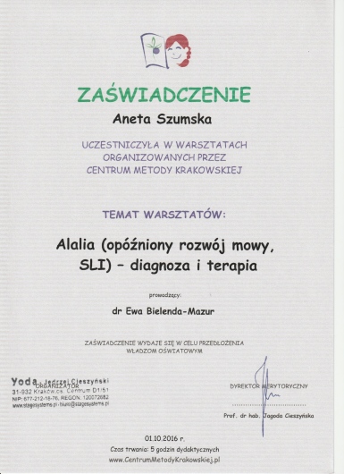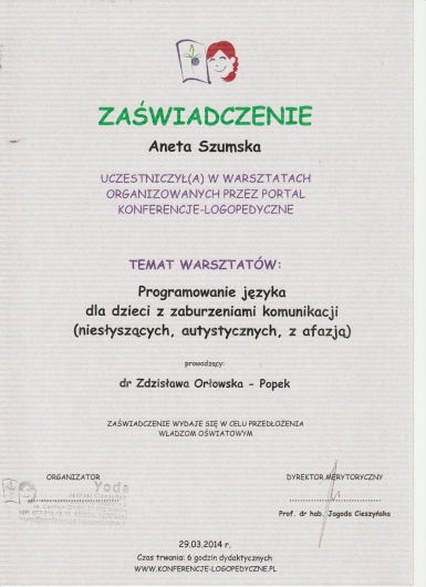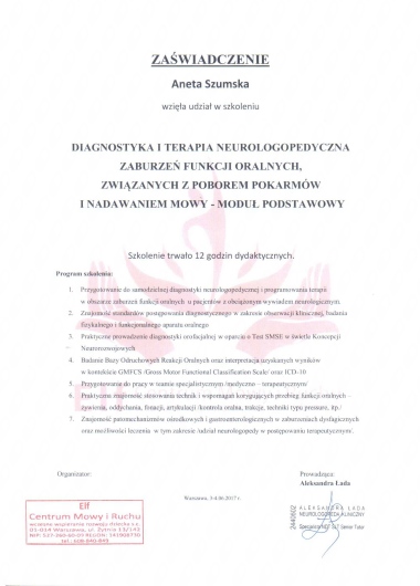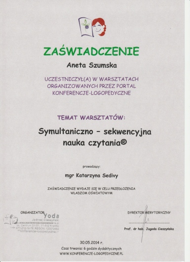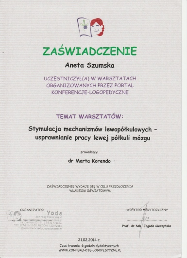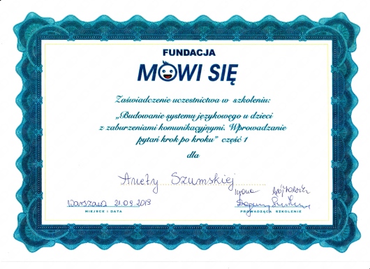 Pokazuję Rodzicom jak programować język (tzn. nauczyć sposobu opisywania otaczającego świata) w sytuacji, gdy Dziecko nie mówi. Prowadzę naukę czytania metodą sylabową. Uczę Dzieci umiejętności czytania ze zrozumieniem, prowadząc systemową terapię wszystkich funkcji poznawczych. Dzięki nauce czytania, Dziecko szybko uczy się prawidłowej wymowy. Ucząc się czytać, Dziecko przyswaja też poprawną odmianę wyrazów i budowę zdań. Zajmując się Pacjentem, korzystam z możliwości konsultacji z innymi specjalistami pracującymi w Klinice Smyka: osteopatą, fizjoterapeutą pediatrycznym (NDT Bobath, Vojta), neurologiem, psychologiem, terapeutą ręki i integracji sensorycznej, dietetykiem, lekarzem rehabilitacji. Pozwala to na zespołowe oddziaływanie i holistyczne spojrzenie na trudności, z którymi zgłasza się Pacjent. Możliwe jest zaplanowanie i prowadzenie wspólnej pracy terapeutycznej.