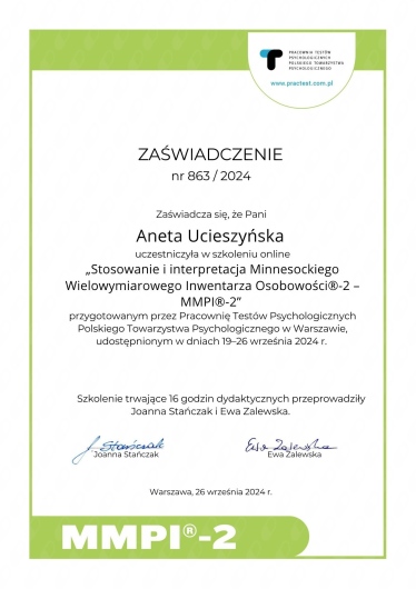 Jaki jest zakres porad oferowanych przez Aneta Ucieszyńska?Aneta Ucieszyńska to psycholog. Na podstawie swojego doświadczenia i wykształcenia Aneta Ucieszyńska oferuje usługi takie jak: Konsultacja psychologiczna, Terapia psychologiczna, Diagnoza spektrum autyzmu ASRS, Diagnoza ADHD test diva 5.0, ADOS-2 - diagnoza autyzmu u dzieci, młodzieży i dorosłych, Test MoXo, Konsultacja psychologiczna online, Diagnoza osobowości MMPI, Conners 3 .