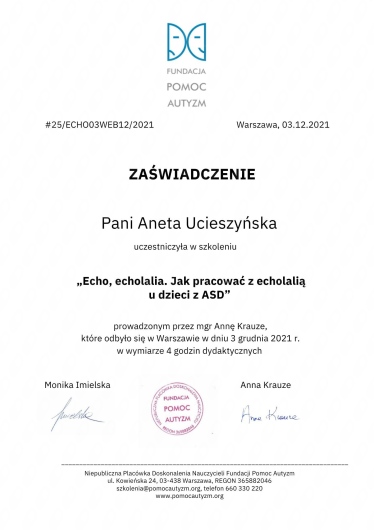 Bardzo polecam wizytę u p. Anety. Moje dziecko zostało nareszcie dobrze zdiagnozowane. Pani Aneta jest ciepłą i wyrozumiałą osobą a także doskonałym psychologiem od zespołu Aspergera.