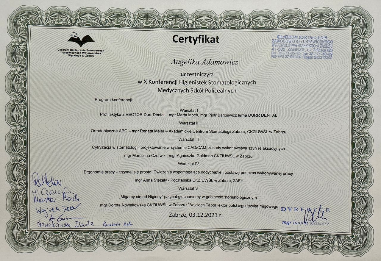 Jaki jest zakres porad oferowanych przez Angelika Adamowicz?Angelika Adamowicz to higienistka/higienista stomatologiczny. Na podstawie swojego doświadczenia i wykształcenia Angelika Adamowicz oferuje usługi takie jak: higienizacja, scaling, piaskowanie, fluoryzacja zębów, Regeneracyjne wybielanie zębów.