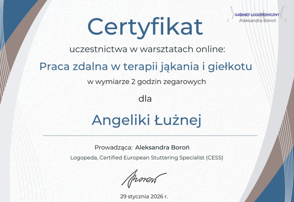 Z panią Angeliką współpracuję regularnie, dlatego z pełnym przekonaniem mogę ją polecić. Zawsze wyróżnia ją indywidualne podejście do pacjenta — każda terapia jest przemyślana i dopasowana dokładnie do konkretnego problemu. Za każdym razem przygotowuje spersonalizowane materiały.