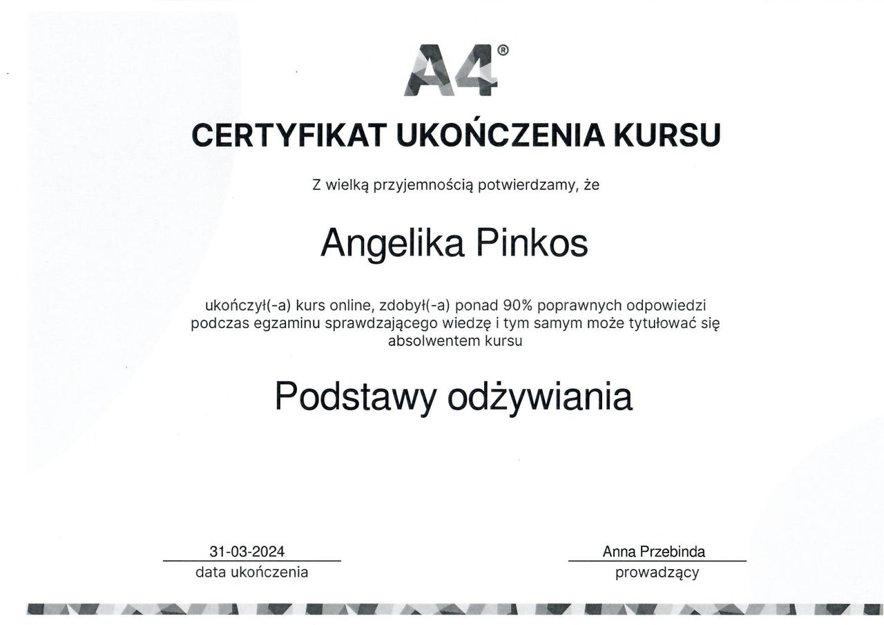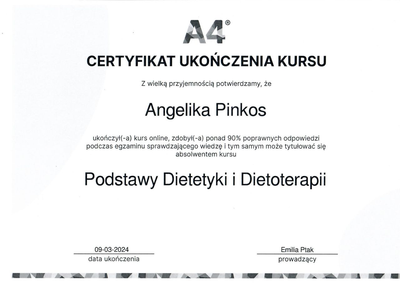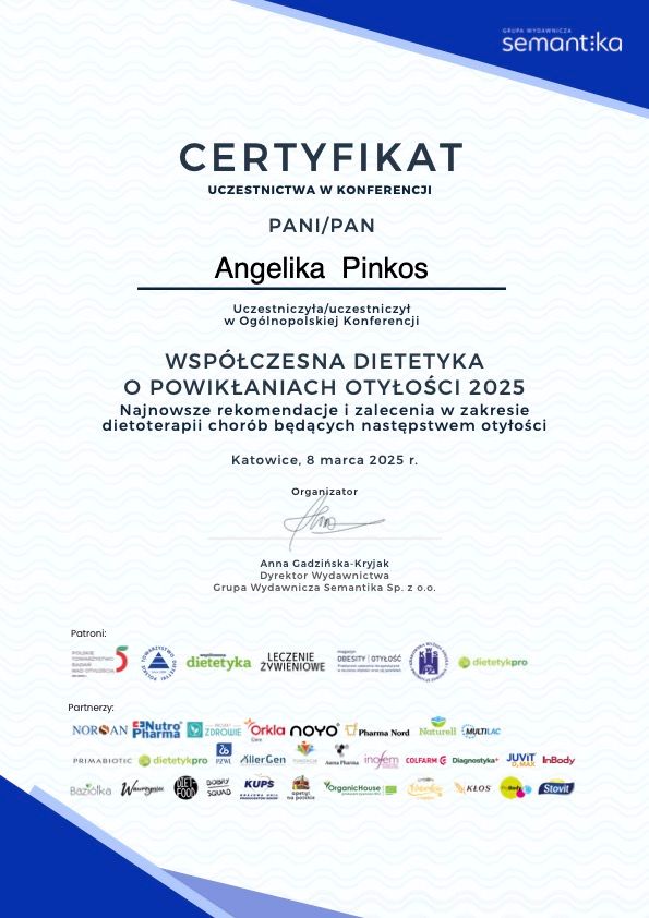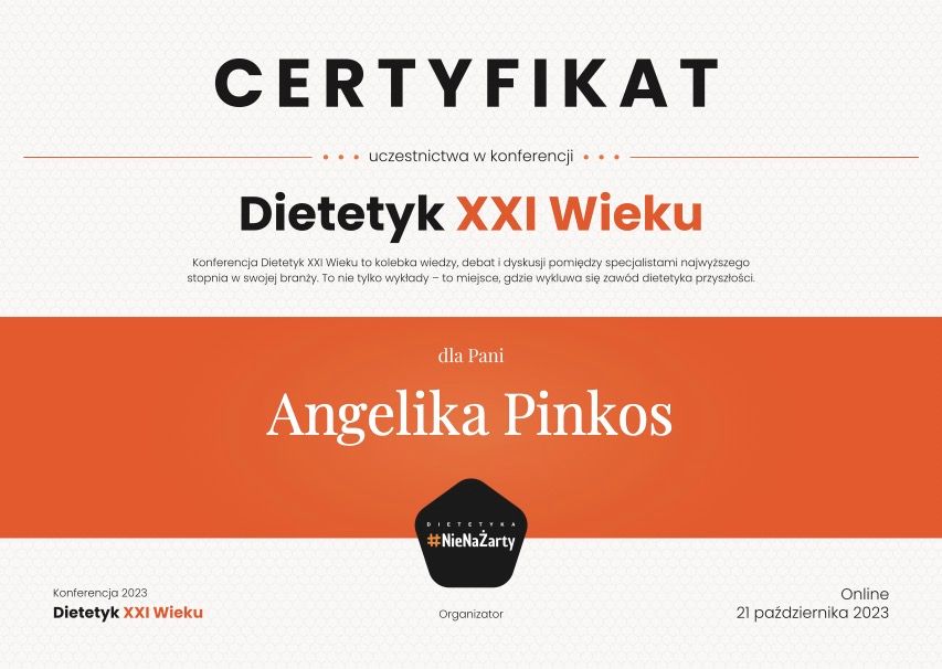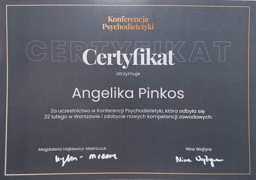 Jaki jest zakres porad oferowanych przez Angelika Pinkos?Angelika Pinkos to dietetyk. Na podstawie swojego doświadczenia i wykształcenia Angelika Pinkos oferuje usługi takie jak: konsultacja dietetyczna (pierwsza) + analiza składu ciała, edukacja żywieniowa, konsultacja dietetyczna (pierwsza wizyta), Konsultacja dietetyczna (kolejna wizyta), Pierwsza konsultacja dietetyczna + 7 dniowy jadłospis, Pierwsza konsultacja dietetyczna + 14 dniowy jadłospis, konsultacja dietetyczna + jadłospis 7-dniowy, konsultacja dietetyczna + jadłospis 14-dniowy, Konsultacja psychodietetyczna (pierwsza wizyta), Konsultacja psychodietetyczna (kolejna wizyta).