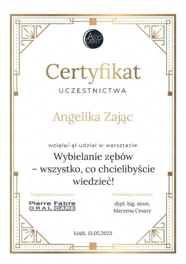 Pełen profesjonalizm i sympatyczna atmosfera. Nie chcę już iść na higienizację do nikogo innego. Polecam serdecznie wizytę u Pani Angeliki :)