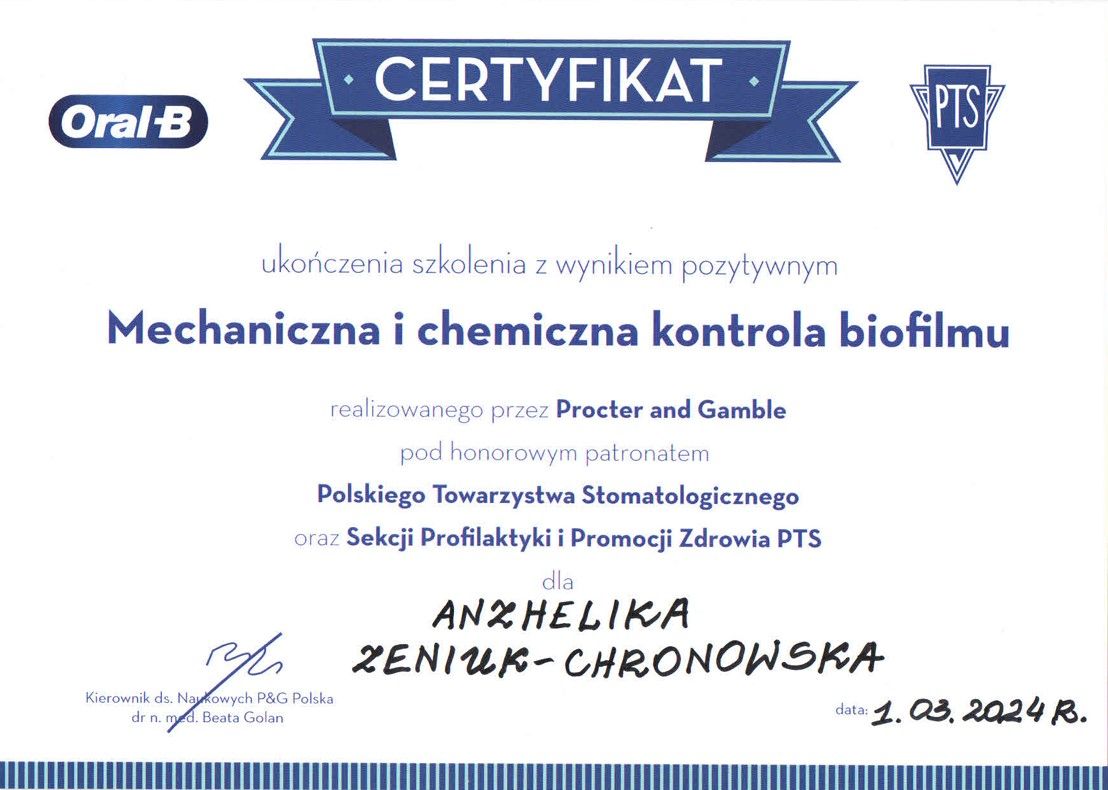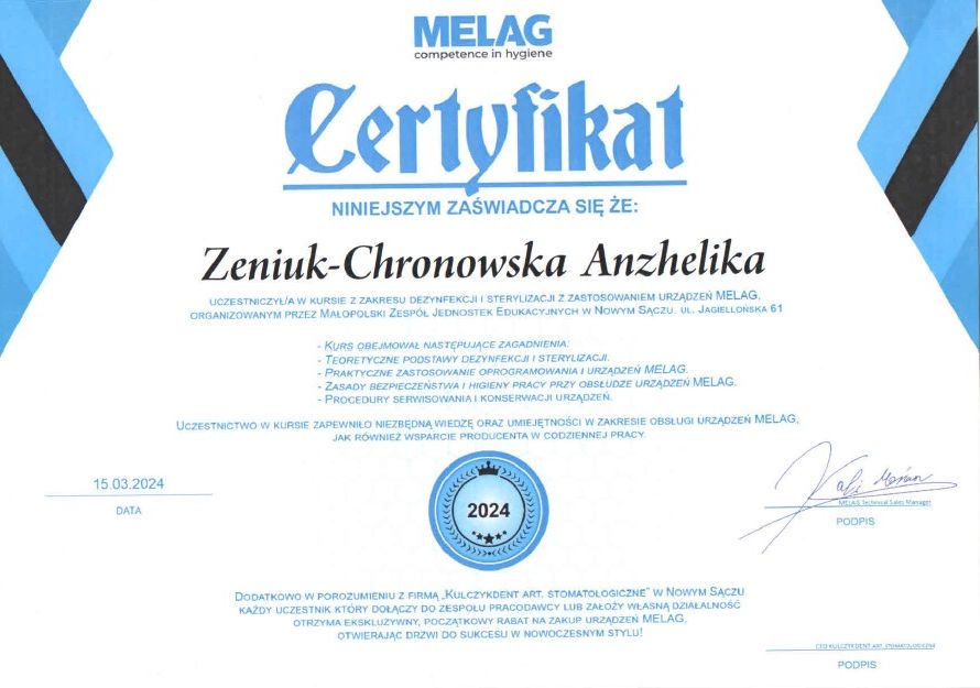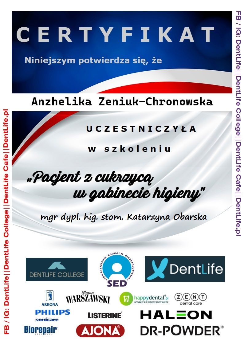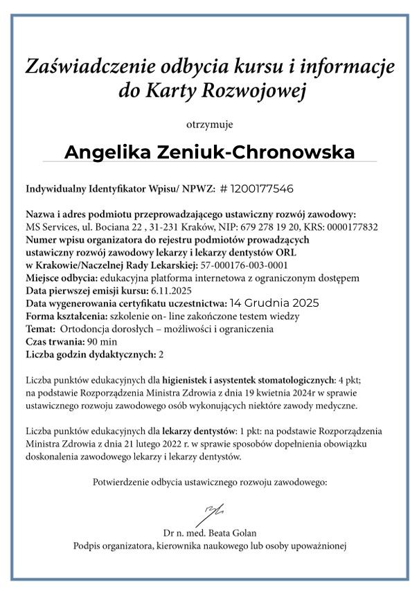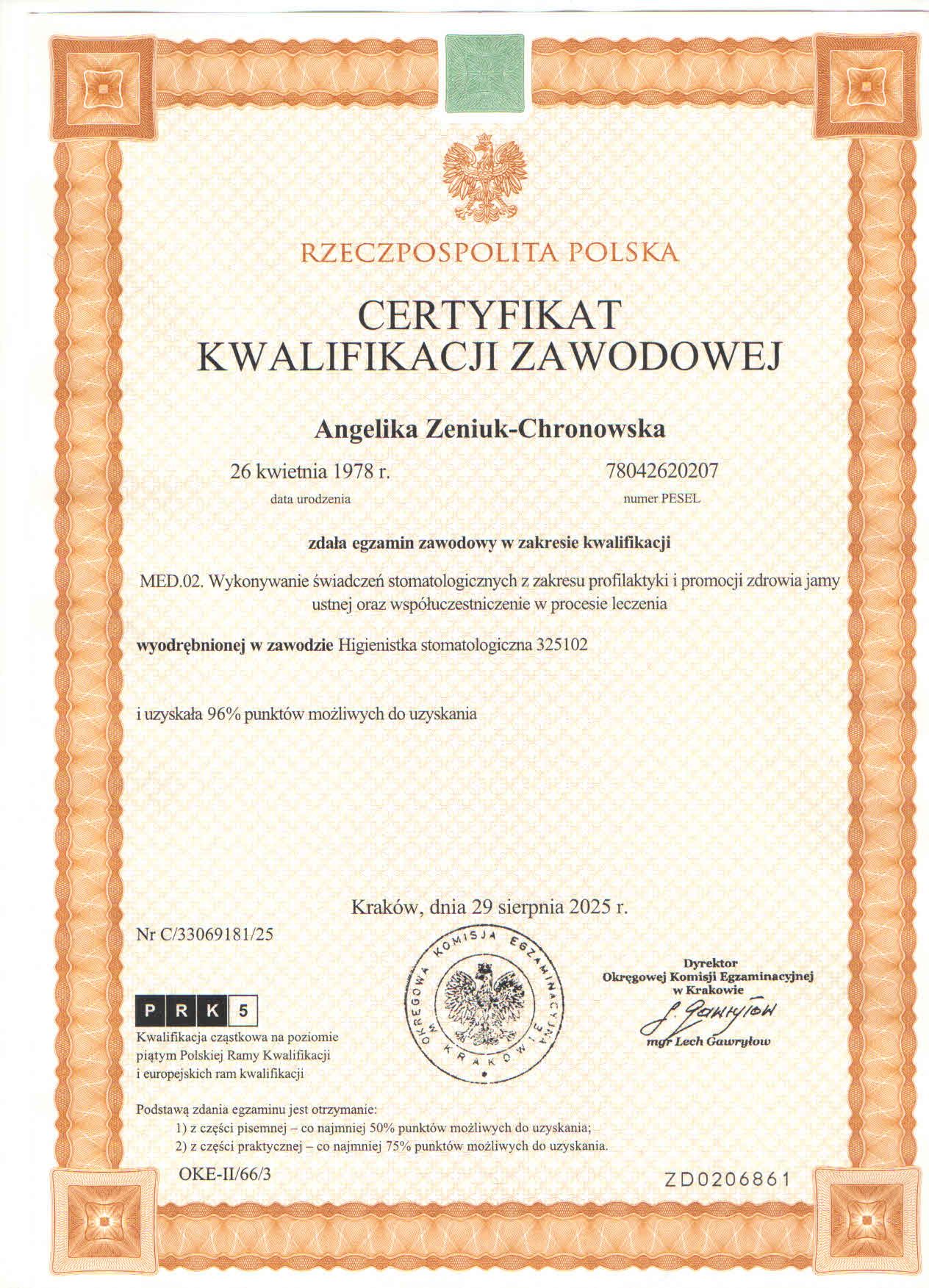 Stale rozwijam się zawodowo, śledząc nowinki z zakresu stomatologii i higieny jamy ustnej. Regularnie podnoszę swoje kwalifikacje poprzez udział w kursach i szkoleniach z zakresu profilaktyki stomatologicznej, nowoczesnych metod higienizacji, pracy z pacjentem periodontologicznym oraz edukacji zdrowotnej. Pracuję zgodnie z aktualnymi standardami i zaleceniami stomatologicznymi.