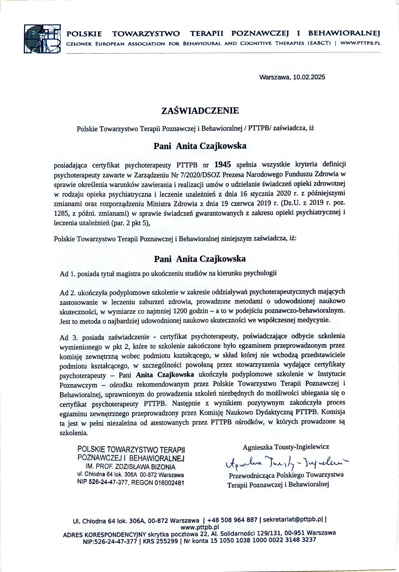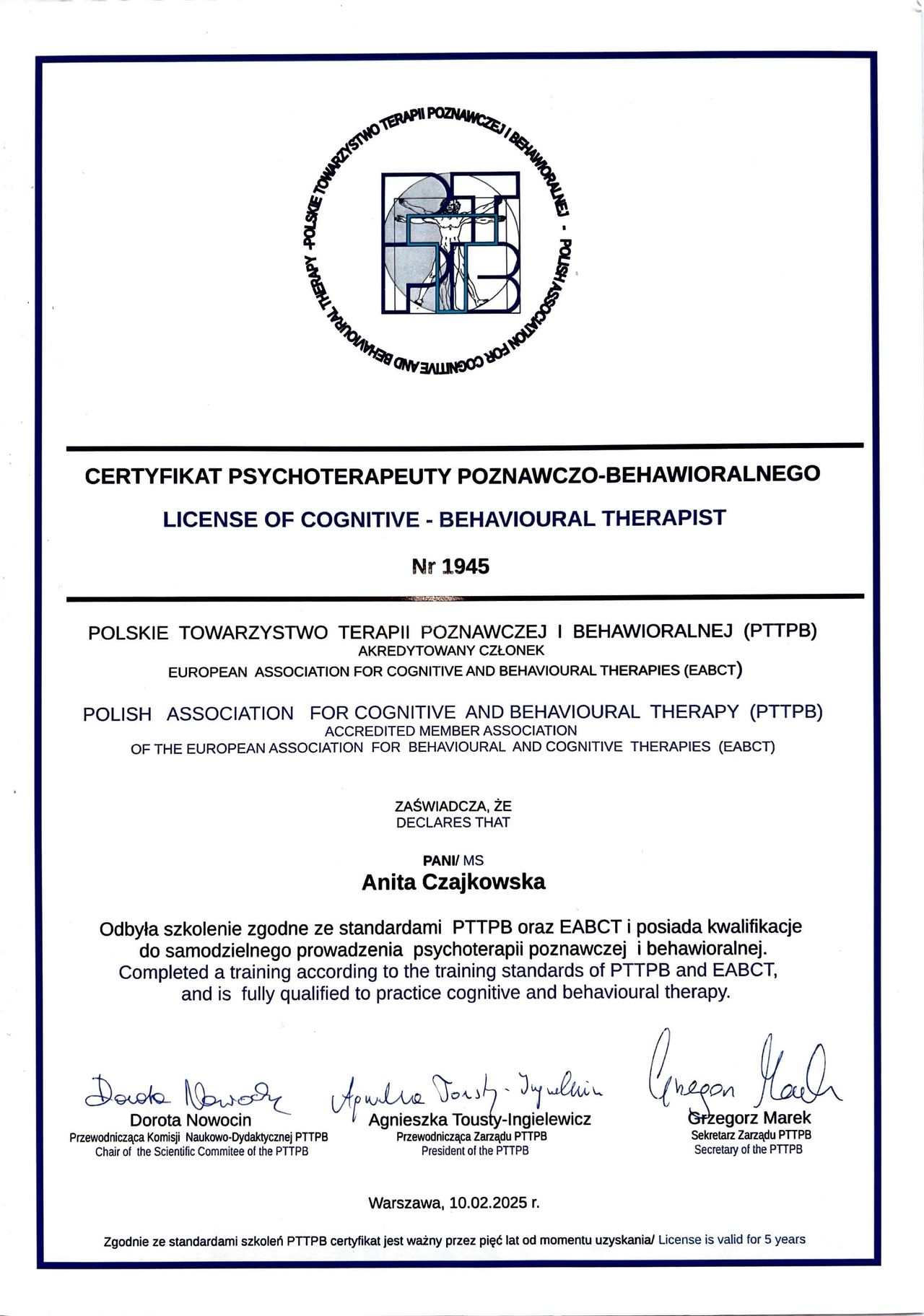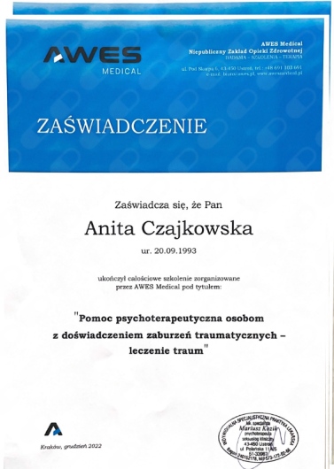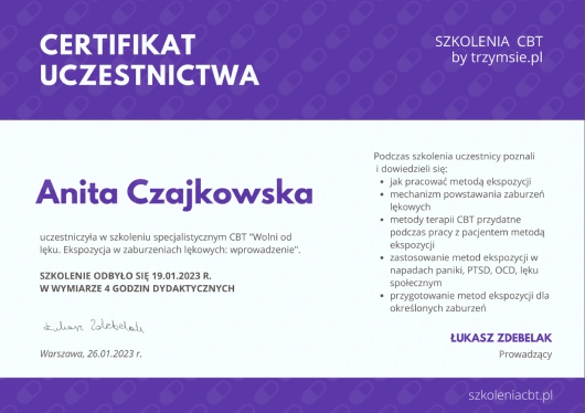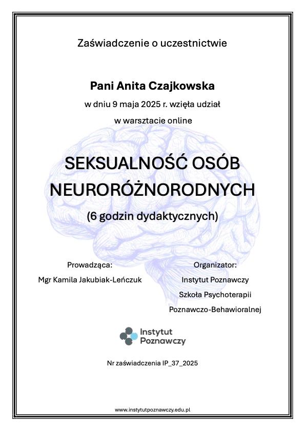 Pani Anita Czajkowska to wspaniała terapeutka – empatyczna, uważna i profesjonalna. Terapia pomogła mi lepiej zrozumieć ADHD oraz poradzić sobie z codziennymi trudnościami. Polecam każdemu, kto szuka realnego wsparcia.