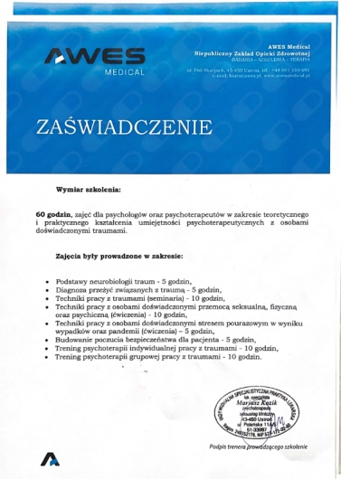 Aktualnie współpracuję z platformą Trzymsie.pl prowadząc terapie indywidualną online osób dorosłych oraz rozwijam prywatną praktykę online i stacjonarnie w Gabinety Altanowa w Krakowie pod stałą superwizją.