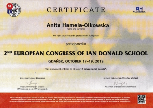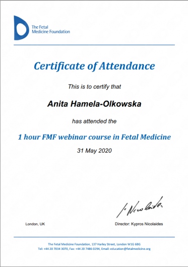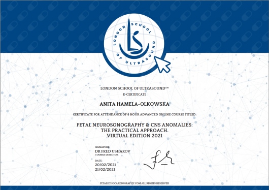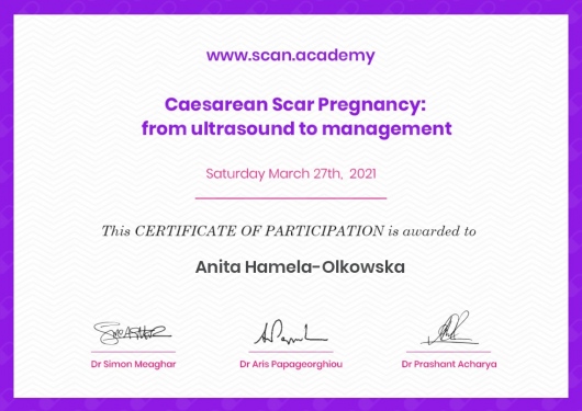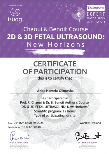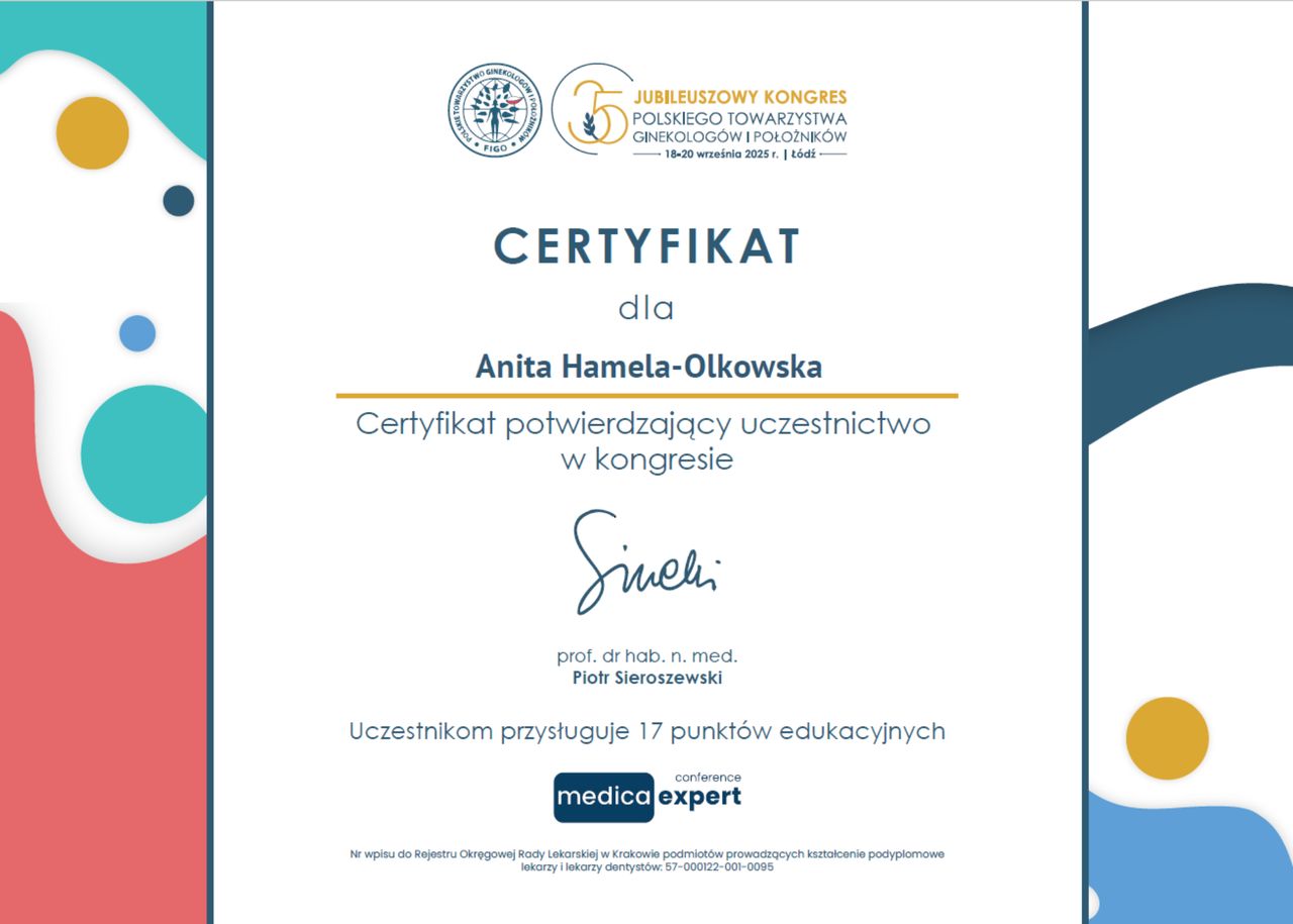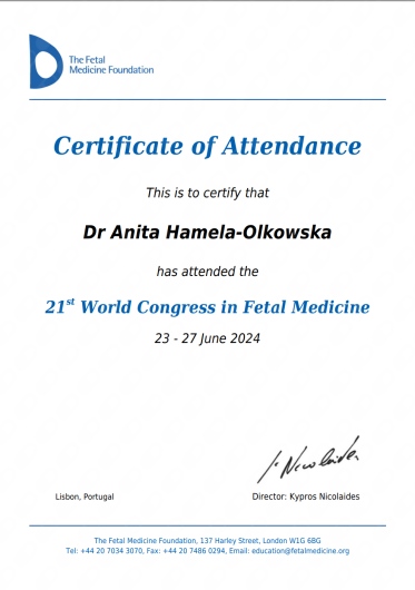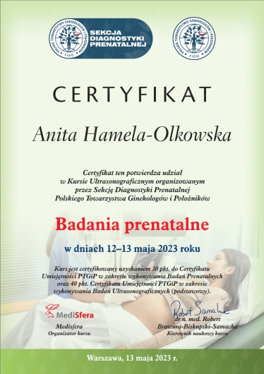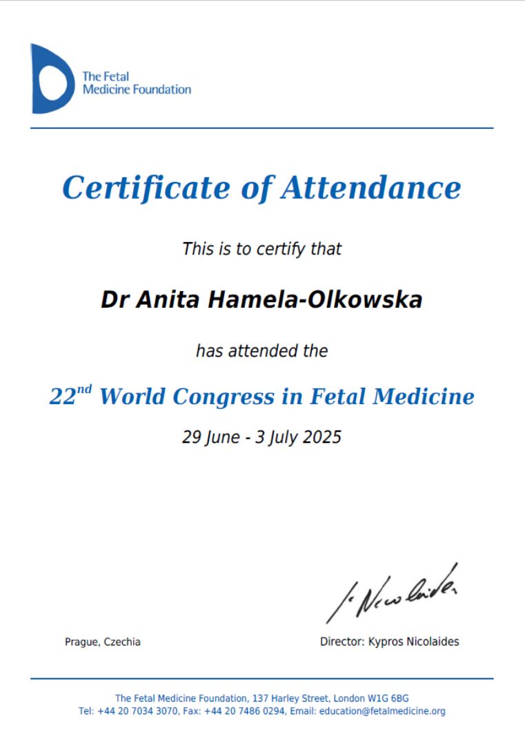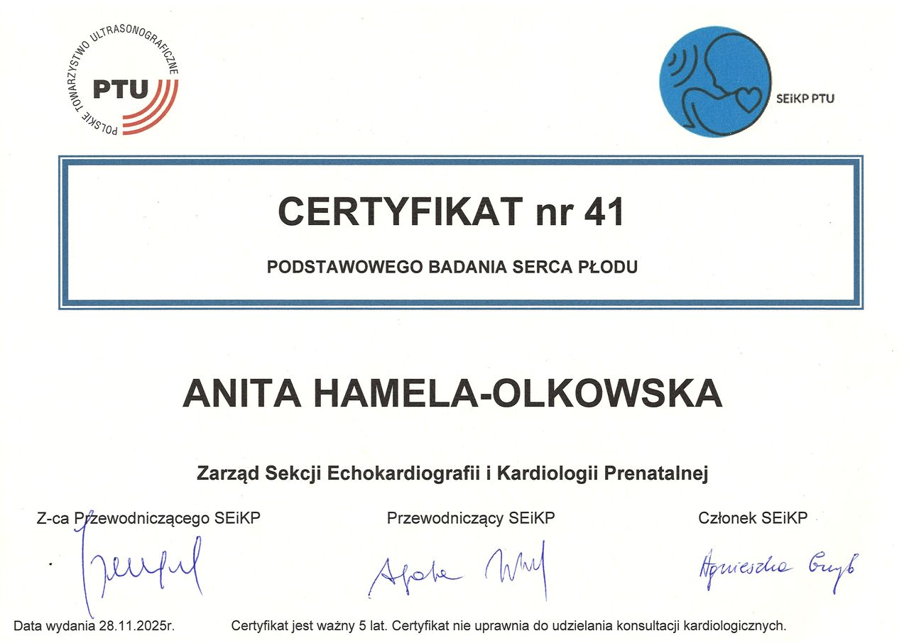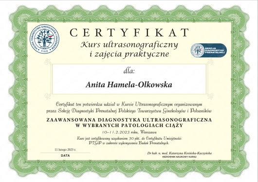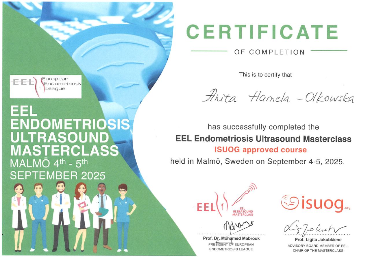 Specjalista położnictwa, ginekologii i perinatologii. Certyfikowany ultrasonografista: 1. Certyfikaty The Fetal Medicine Foundation (nr 32301): - Certificate of Competence: Ultrasound Examination at 11-13,6 weeks (przezierność karkowa, kość nosowa, zastawka trójdzielna, przewód żylny, tętnice maciczne), - Certificate of Competence in Ultrasound Examination at 20-22 weeks, - Certificate of Competence in Doppler Ultrasound, - Certificate of Competence in Cervical Assessment. 2. Certyfikat przesiewowego badania serca płodu Sekcji Echokardiografii i Kardiologii Prenatalnej Polskiego Towarzystwa Ultrasonograficznego. 3. Certyfikat The International Ovarian Tumor Analysis (IOTA). Ukończyła z wyróżnieniem I Wydział Lekarski Warszawskiego Uniwersytetu Medycznego. Autor pracy doktorskiej z kardiologii prenatalnej pt. „Diagnostyka i terapia zaburzeń przewodzenia i rytmu serca u płodów”, obronionej z wyróżnieniem na I Wydziale Lekarskim Warszawskiego Uniwersytetu Medycznego. W 2020 roku zdała Państwowy Egzamin Specjalizacyjny z Perinatologii z najlepszym wynikiem w kraju. Wykładowca w Klinice Położnictwa, Perinatologii i Neonatologii Centrum Medycznego Kształcenia Podyplomowego w Szpitalu Bielańskim w Warszawie. Wieloletni pracownik Poradni Kardiologii Prenatalnej w Szpitalu Klinicznym im. ks. Anny Mazowieckiej w Warszawie, ul. Karowa 2. Wykładowca na kursach USG dla lekarzy. Odbyła szkolenie z zakresu ultrasonografii w wiodącym ośrodku medycyny płodowej w King's College w Londynie. Ukończyła specjalizację z perinatologii z wynikiem bardzo dobrym. Specjalizuje się w prenatalnej diagnostyce ultrasonograficznej (w tym w diagnostyce ciąż mnogich), diagnostyce wad płodu, echokardiografii płodowej, prowadzeniu ciąży fizjologicznej oraz ciąży wysokiego ryzyka, ultrasonografii ginekologicznej, diagnostyce poronień nawykowych. Wykonuje USG endometriozy głębokiej z użyciem kontrastu żelowego. Prowadzi pacjentki ciężarne z endometriozą głęboką i adenomiozą. Posiada uprawnienia do zakładania implantu antykoncepcyjnego Implanon NXT oraz wkładki antykoncepcyjnej GyneFix. Stale podnosi swoje kwalifikacje, uczestnicząc w konferencjach naukowych zagranicznych i krajowych. Członkostwo w International Society of Ultrasound in Obstetrics and Gynecology (ISUOG), Sekcji Echokardiografii i Kardiologii Prenatalnej Polskiego Towarzystwa Ultrasonograficznego, Polskim Towarzystwie Ginekologów i Położników oraz European Endometriosis League. Prowadzi edukacyjny profil medyczny na Instagramie - link poniżej.