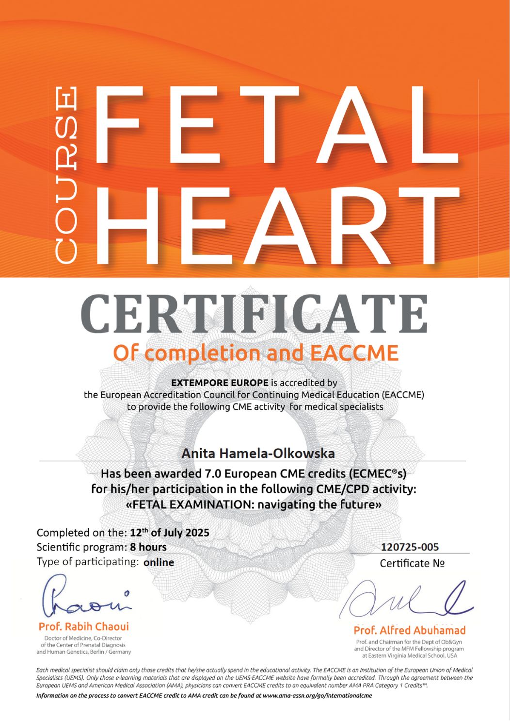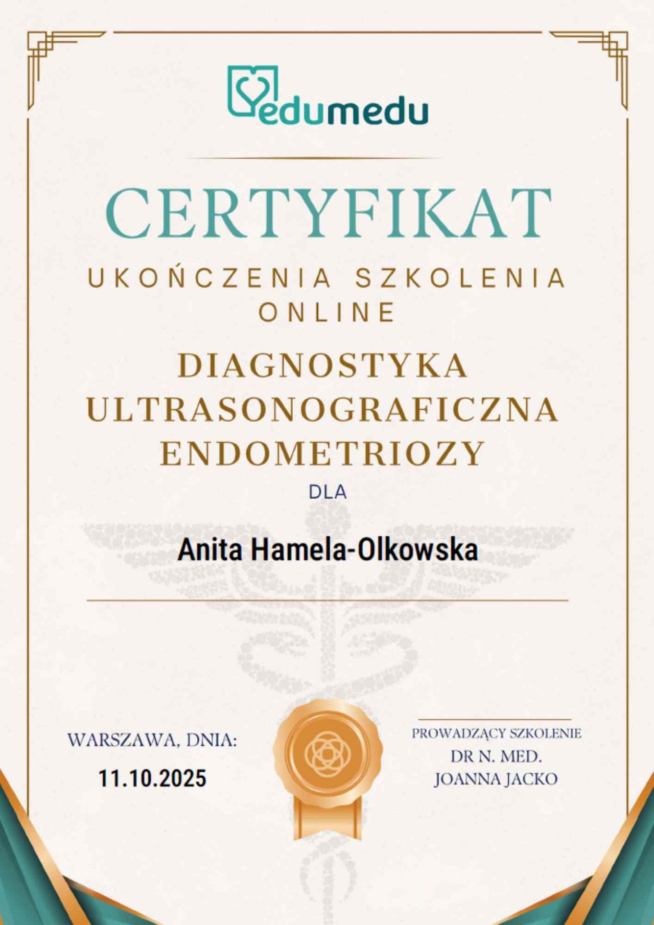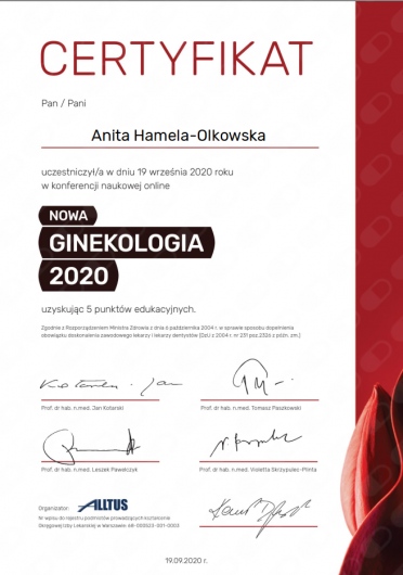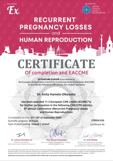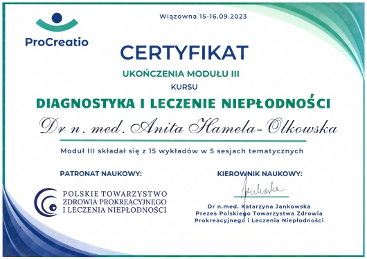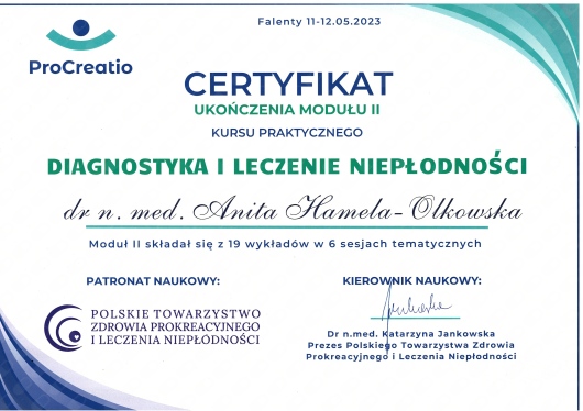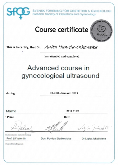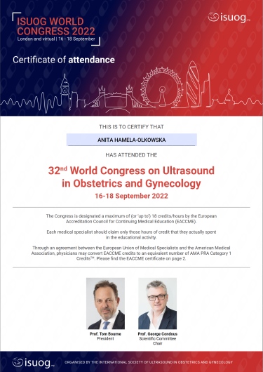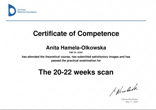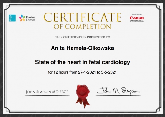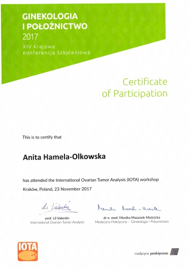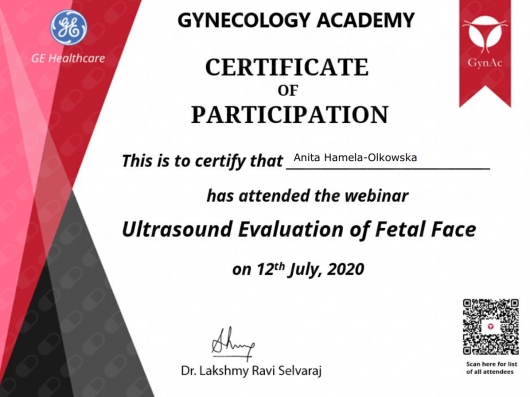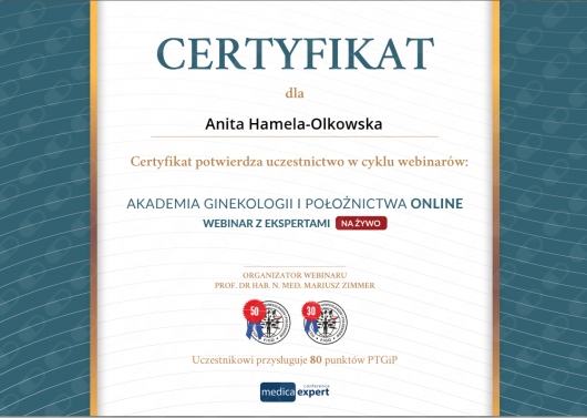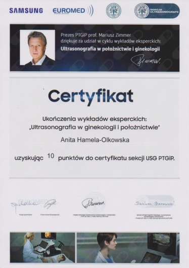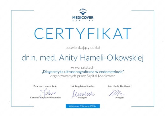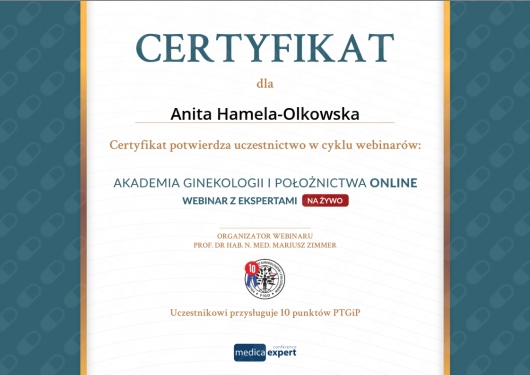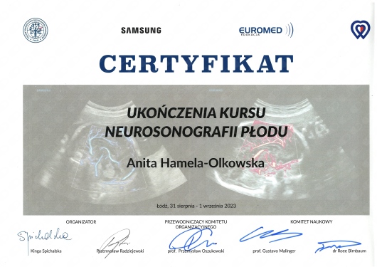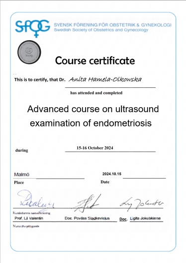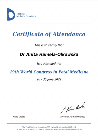 Specjalista położnictwa, ginekologii i perinatologii. Certyfikowany ultrasonografista: 1. Certyfikaty The Fetal Medicine Foundation (nr 32301): - Certificate of Competence: Ultrasound Examination at 11-13,6 weeks (przezierność karkowa, kość nosowa, zastawka trójdzielna, przewód żylny, tętnice maciczne), - Certificate of Competence in Ultrasound Examination at 20-22 weeks, - Certificate of Competence in Doppler Ultrasound, - Certificate of Competence in Cervical Assessment. 2. Certyfikat przesiewowego badania serca płodu Sekcji Echokardiografii i Kardiologii Prenatalnej Polskiego Towarzystwa Ultrasonograficznego. 3. Certyfikat The International Ovarian Tumor Analysis (IOTA). Ukończyła z wyróżnieniem I Wydział Lekarski Warszawskiego Uniwersytetu Medycznego. Autor pracy doktorskiej z kardiologii prenatalnej pt. „Diagnostyka i terapia zaburzeń przewodzenia i rytmu serca u płodów”, obronionej z wyróżnieniem na I Wydziale Lekarskim Warszawskiego Uniwersytetu Medycznego. W 2020 roku zdała Państwowy Egzamin Specjalizacyjny z Perinatologii z najlepszym wynikiem w kraju. Wykładowca w Klinice Położnictwa, Perinatologii i Neonatologii Centrum Medycznego Kształcenia Podyplomowego w Szpitalu Bielańskim w Warszawie. Wieloletni pracownik Poradni Kardiologii Prenatalnej w Szpitalu Klinicznym im. ks. Anny Mazowieckiej w Warszawie, ul. Karowa 2. Wykładowca na kursach USG dla lekarzy. Odbyła szkolenie z zakresu ultrasonografii w wiodącym ośrodku medycyny płodowej w King's College w Londynie. Ukończyła specjalizację z perinatologii z wynikiem bardzo dobrym. Specjalizuje się w prenatalnej diagnostyce ultrasonograficznej (w tym w diagnostyce ciąż mnogich), diagnostyce wad płodu, echokardiografii płodowej, prowadzeniu ciąży fizjologicznej oraz ciąży wysokiego ryzyka, ultrasonografii ginekologicznej, diagnostyce poronień nawykowych. Wykonuje USG endometriozy głębokiej z użyciem kontrastu żelowego. Prowadzi pacjentki ciężarne z endometriozą głęboką i adenomiozą. Posiada uprawnienia do zakładania implantu antykoncepcyjnego Implanon NXT oraz wkładki antykoncepcyjnej GyneFix. Stale podnosi swoje kwalifikacje, uczestnicząc w konferencjach naukowych zagranicznych i krajowych. Członkostwo w International Society of Ultrasound in Obstetrics and Gynecology (ISUOG), Sekcji Echokardiografii i Kardiologii Prenatalnej Polskiego Towarzystwa Ultrasonograficznego, Polskim Towarzystwie Ginekologów i Położników oraz European Endometriosis League. Prowadzi edukacyjny profil medyczny na Instagramie - link poniżej.
