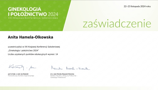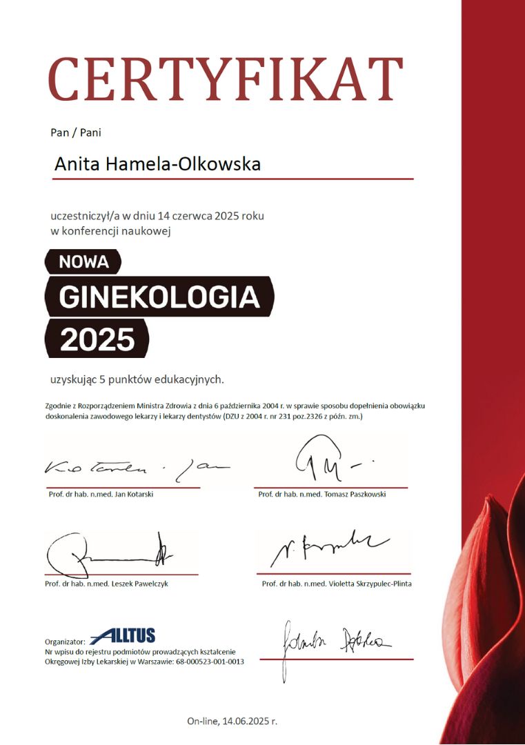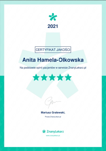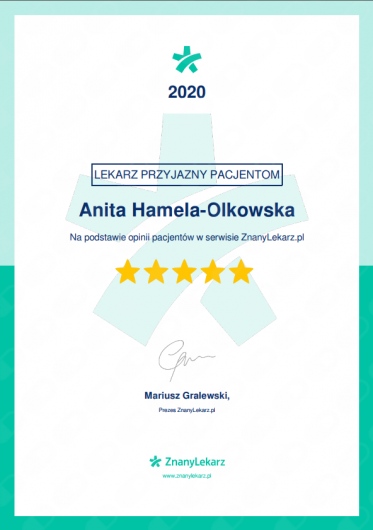 Pani dr Anita Hamela, ginekolog, to lekarz z prawdziwego powołania – profesjonalna, delikatna, uważna i niezwykle zaangażowana. Odpowiedziała na wszystkie moje pytania, rozwiała wątpliwości i poświęciła mi tyle czasu, ile potrzebowałam, również podczas dodatkowej konsultacji wyników badań. To piękny przykład ludzkiego, ciepłego i rzetelnego podejścia do pacjenta, za co jestem bardzo wdzięczna.